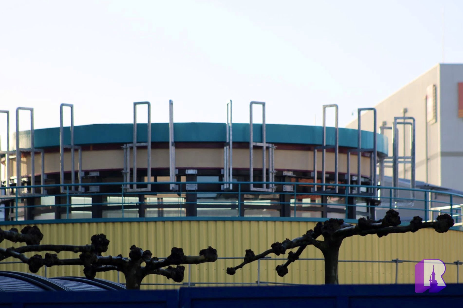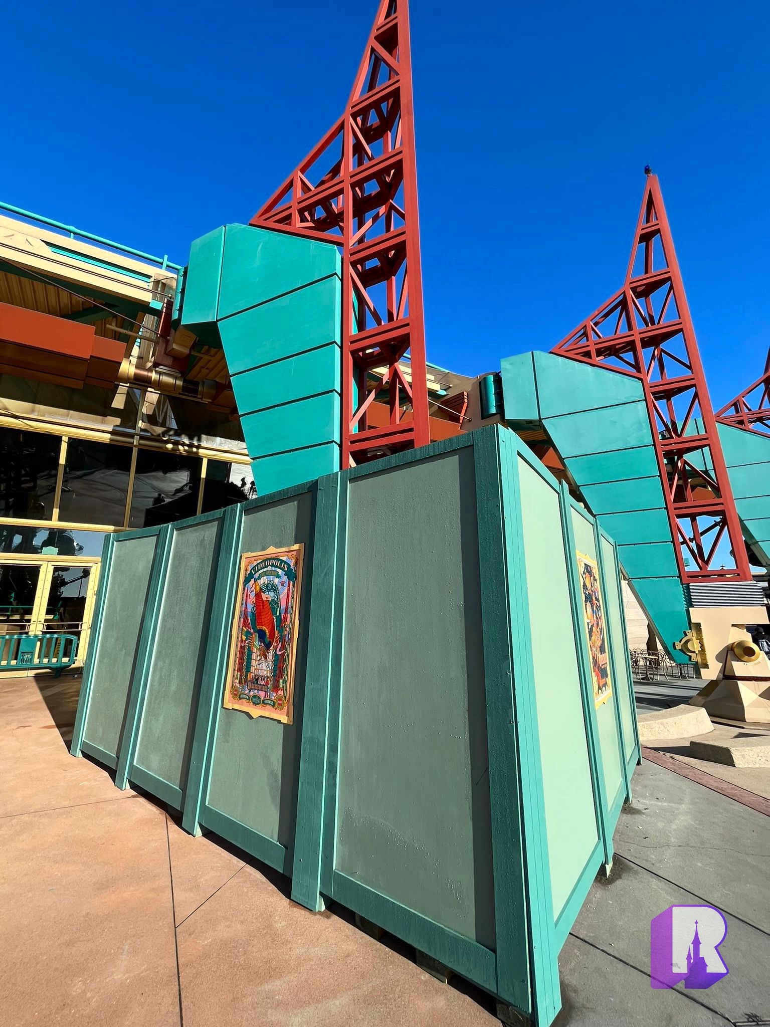 Crossing over into Discoveryland, work is complete on the former Space Mountain Fastpass awning. Looks like the floor was redone. Really curious what – if anything – this will now be used for. Meanwhile, a new project has started nearby by the Videopolis pillars.