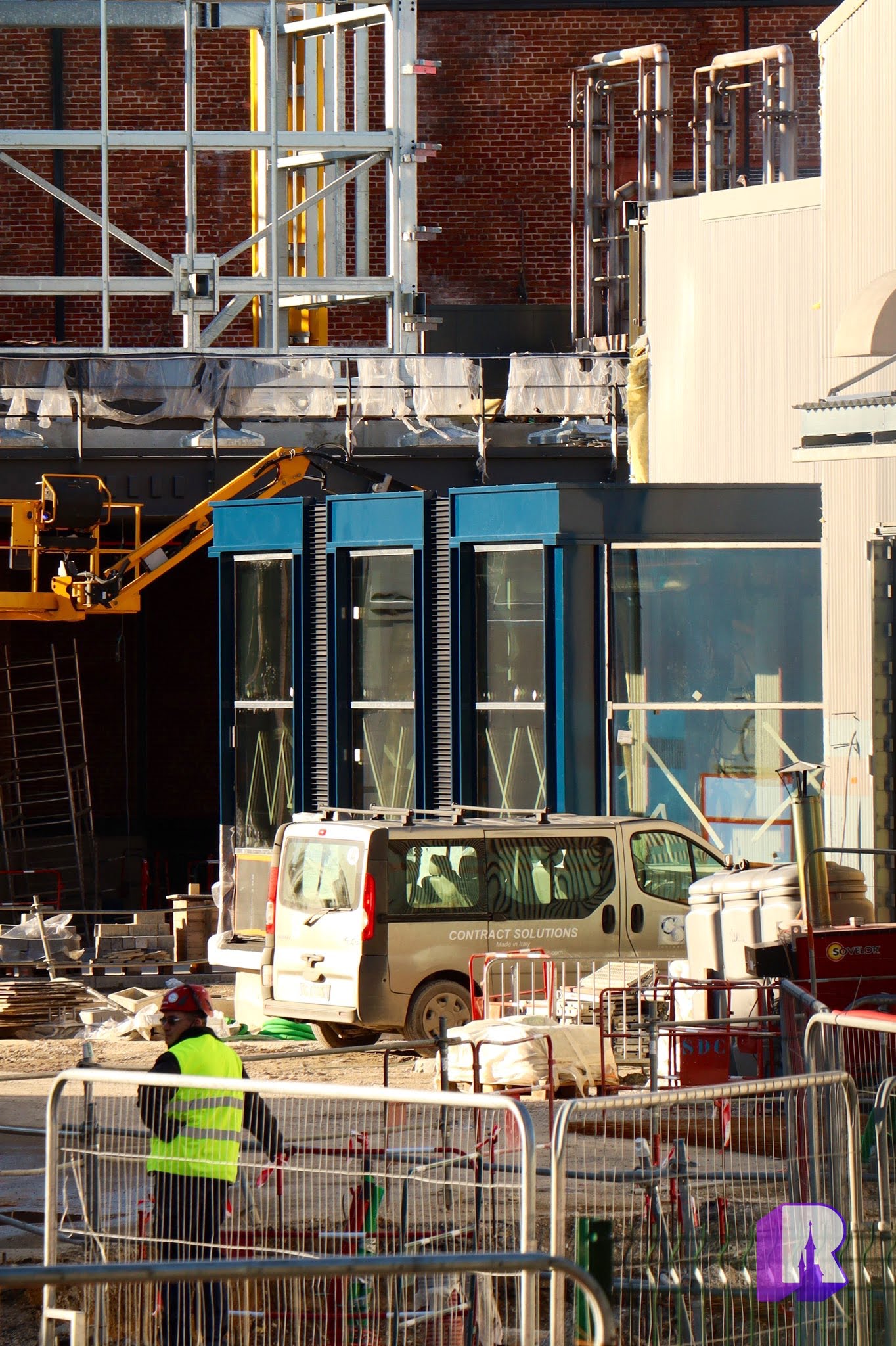 Looking at the “back plaza” side of things, the extension of the quick service restaurant has been assemble…y.. This is the former Blockbuster Cafe. Just across, a new metallic structure appears to be the window display for the Spider-Man shop.