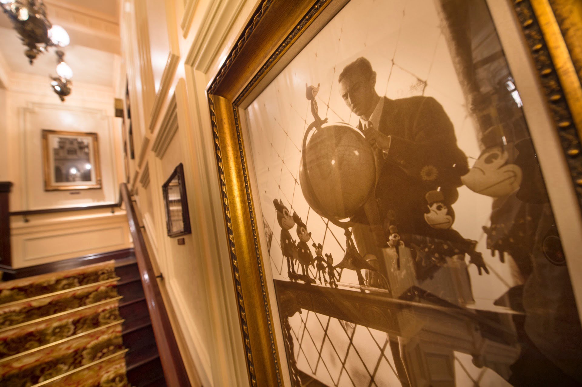 Pour accéder à l’étage, deux moyens s’offrent à nous : l’escalier, avec ses multiples photos des succès de Walt, véritable métaphore de son impressionnante ascension professionnelle, et l’ascenseur, pièce maîtresse du hall, avec sa structure en acajou surmontée d’un dôme de verre richement ouvragé. À cela s’ajoutent les initiales de Walt entremêlées gravées sur les vitres, et dont le design reprend celui créé à l’origine pour la balustrade en fer forgé de son appartement de New Orleans Square, à Disneyland en Californie. On les retrouve également sur d’autres éléments de décoration de la pièce, notamment au niveau du comptoir, à l’entrée du restaurant.