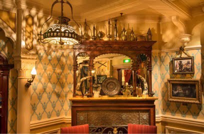 Une fois en haut, les convives découvrent un véritable petit appartement composé d’une salle de réception et de six salons. Les Imagineers firent de nombreuses recherches historiques en termes de décoration d’intérieur, afin de reconstituer au mieux l’ambiance d’une maison du tournant-du-siècle, que ce soit à travers l’utilisation du « lincrusta », un revêtement mural en relief inventé en 1877, ou de l’ « anaglypta », un papier peint texturé mis au point 10 ans plus tard.