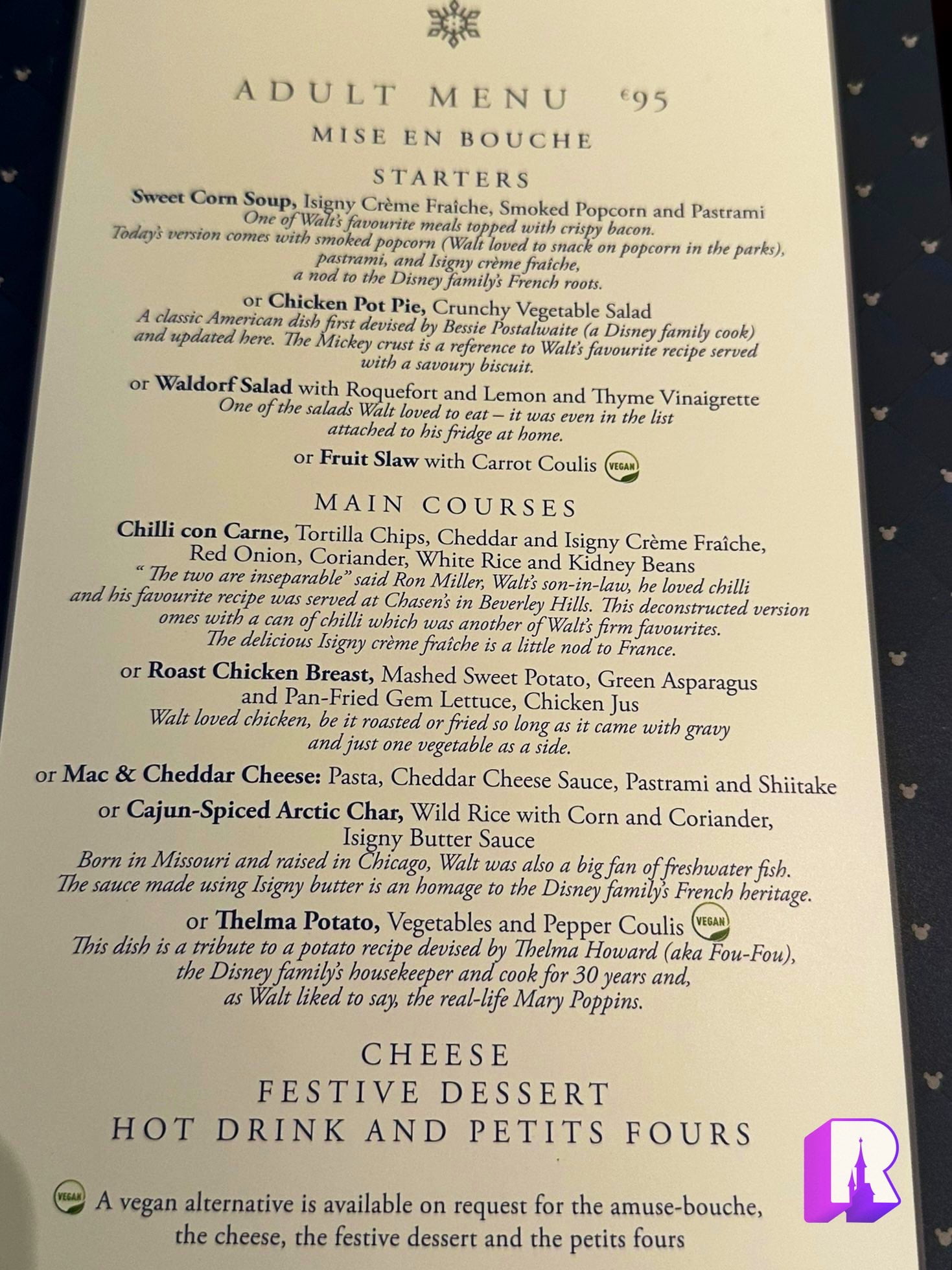 It was odd that Disney didn’t release the details of these expensive meals at table service restaurants. That’s because they are exactly the same as the usual ones with the addition of cheese, a “festive dessert” (what if you don’t like it ?) and petits fours – all for a lot more money. Listen I get that it’s New Years and that every restaurant around the world capitalizes on the occasion but the fact that the food team could not even whip out a special menu to at least try to pretend it was worth the extra cash is just sad.