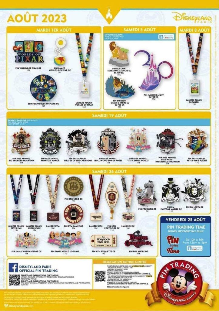 L’affiche des sorties pin’s du mois d’août a été publiée. Au programme ce mois-ci : de nombreux pins sur les attractions iconiques des deux parcs, une collection « Pixar » et notamment un pin’s commémoratif sur le nouveau spectacle nocturne « Disney D-Light ».