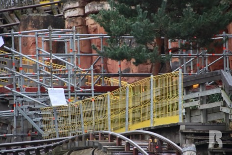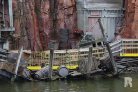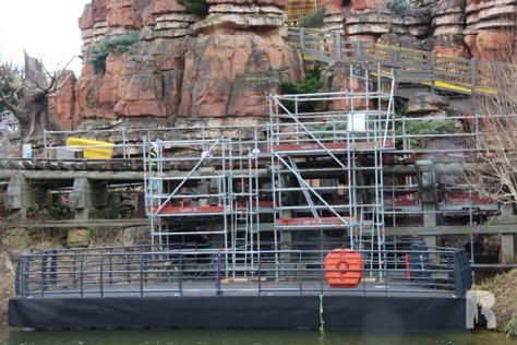 Big Thunder Mountain est partiellement en réhabilitation jusqu’à l’été, avec des réparations et des améliorations de thématisation. Une passerelle flottante a été déployée pour faciliter l’accès au chantier.