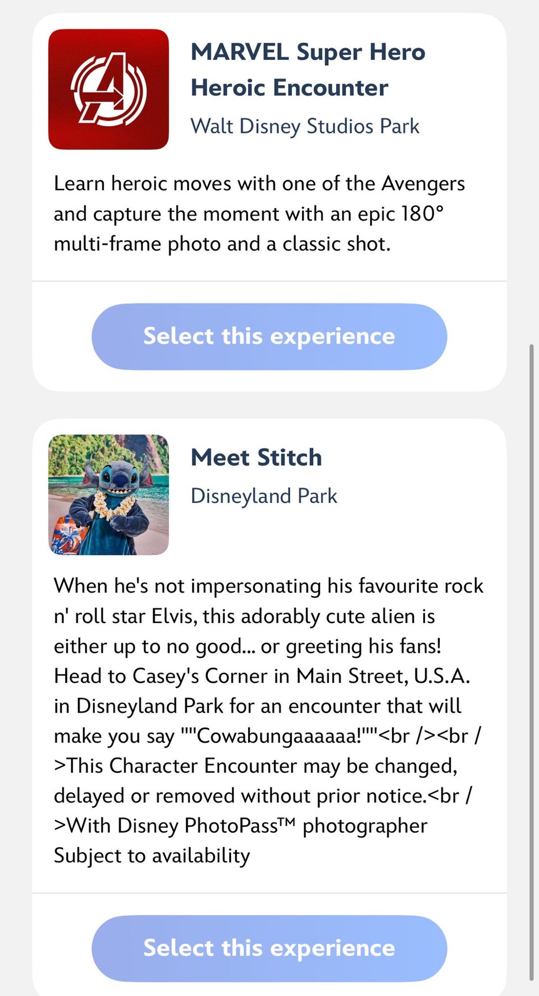An option to Meet Stitch using the same Virtual Queue platform as the Avengers Campus Hero Training Center appeared in the official Disneyland Paris app. Although it’s unavailable for now, it’s hinting at plans to expand this system to other meet and greet locations across the Resort. Stay tuned!