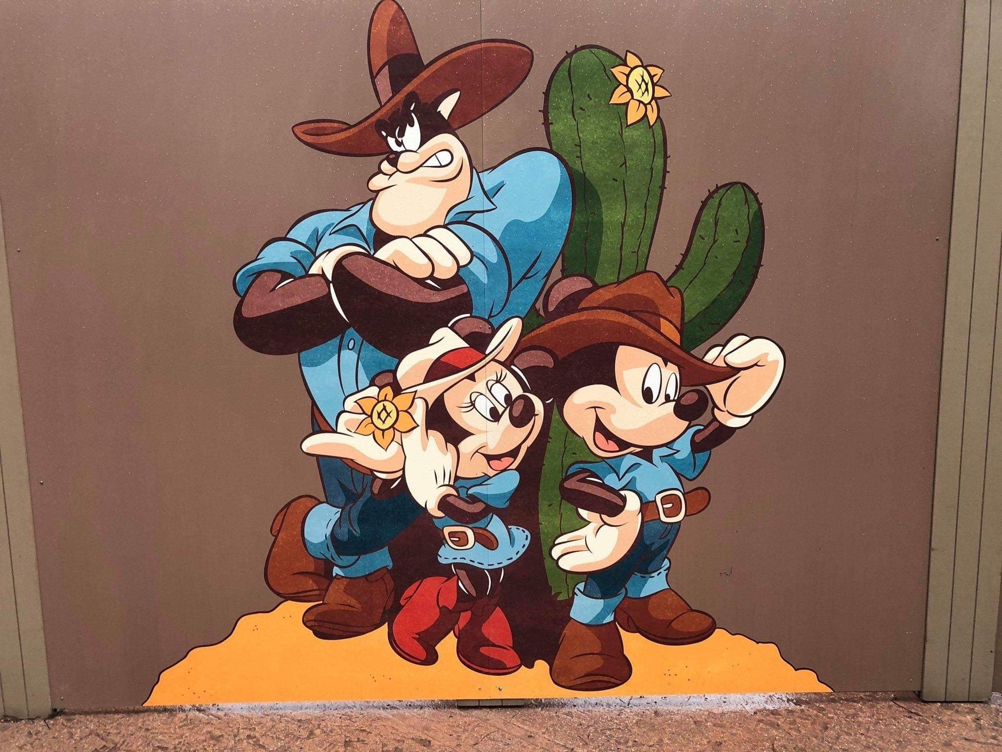More recently, now that Animation Celebration has opened up and the pretty wall has been taken down, Frontierland has gotten some new art on its construction walls that are the perfect photo ops for Wild West-loving guests. One section of the wall has a cute picture of Woody, Jessie, and Bullseye posing in front of a cactus, ready to take photos with guests (which is quite convenient if you don’t want to wait in line to actually meet the characters). Another section has the more classic characters of Mickey Mouse, Minnie Mouse, and Peg-Leg Pete standing around a similar cactus to the Toy Story characters.