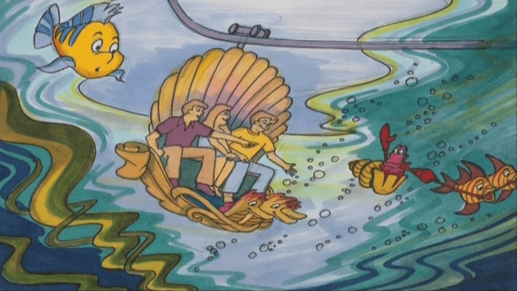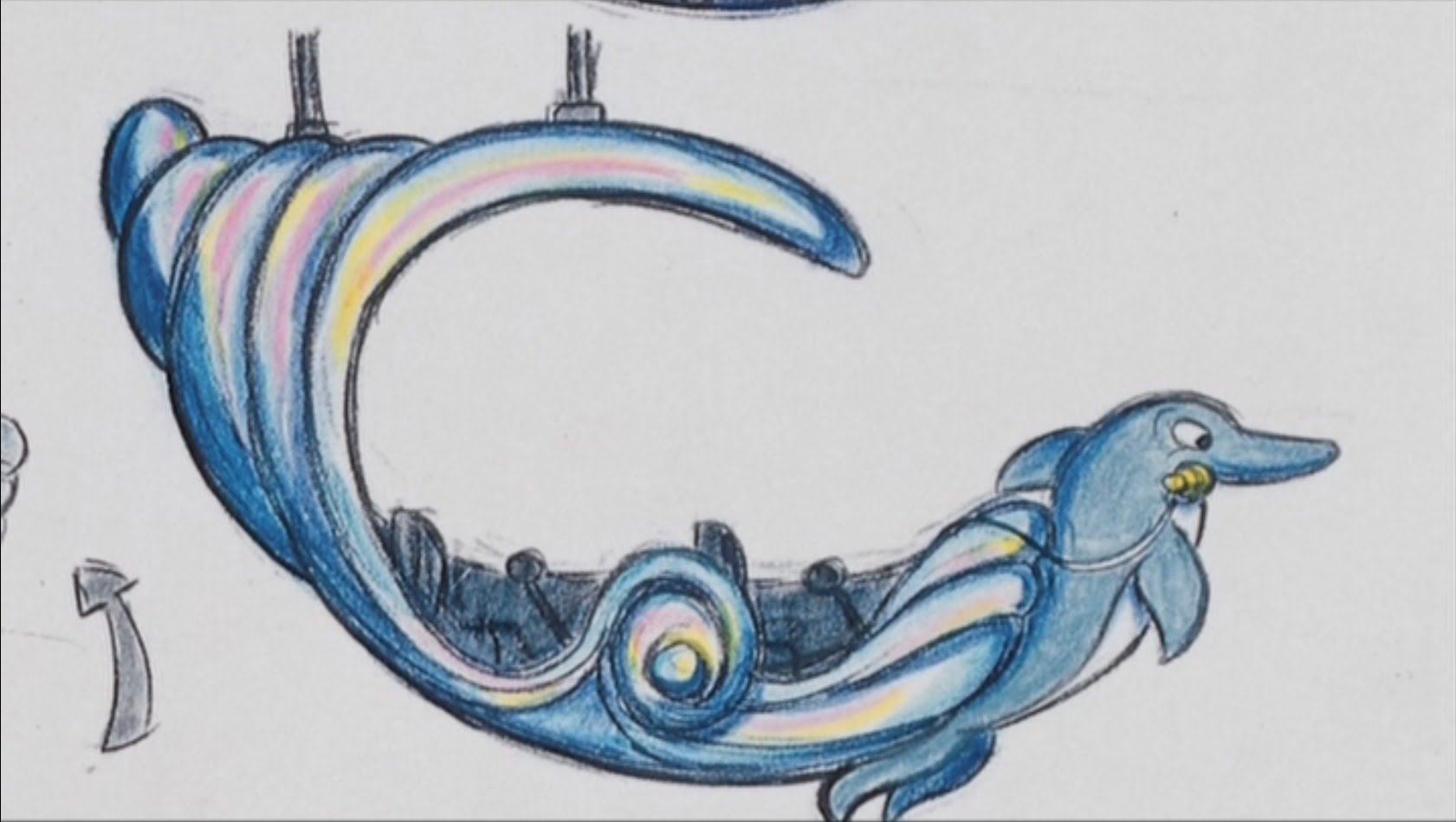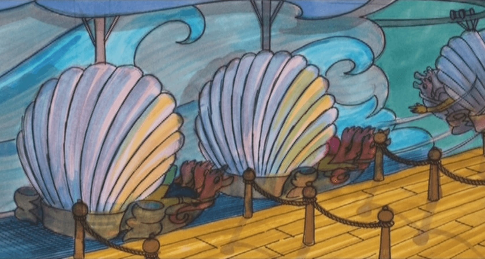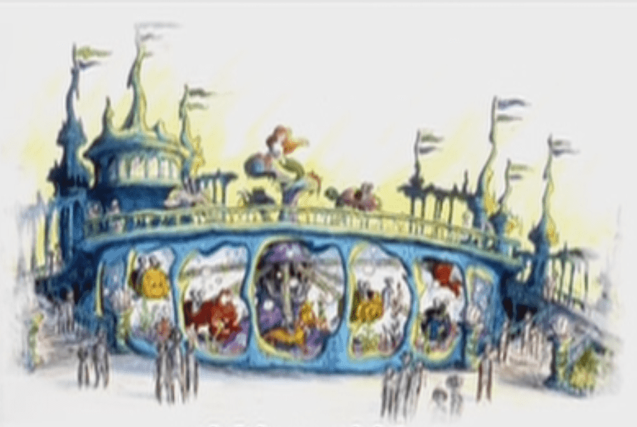 Après avoir sillonné la file d’attente dans les couloirs du château, il est maintenant temps d’embarquer dans l’attraction. Concernant la technologie utilisée, il aurait dû s’agir d’un système de transport suspendu similaire à celui utilisé dans Peter Pan’s Flight. Bien entendu, ici, les bateaux auraient été remplacés par des coquillages géants.