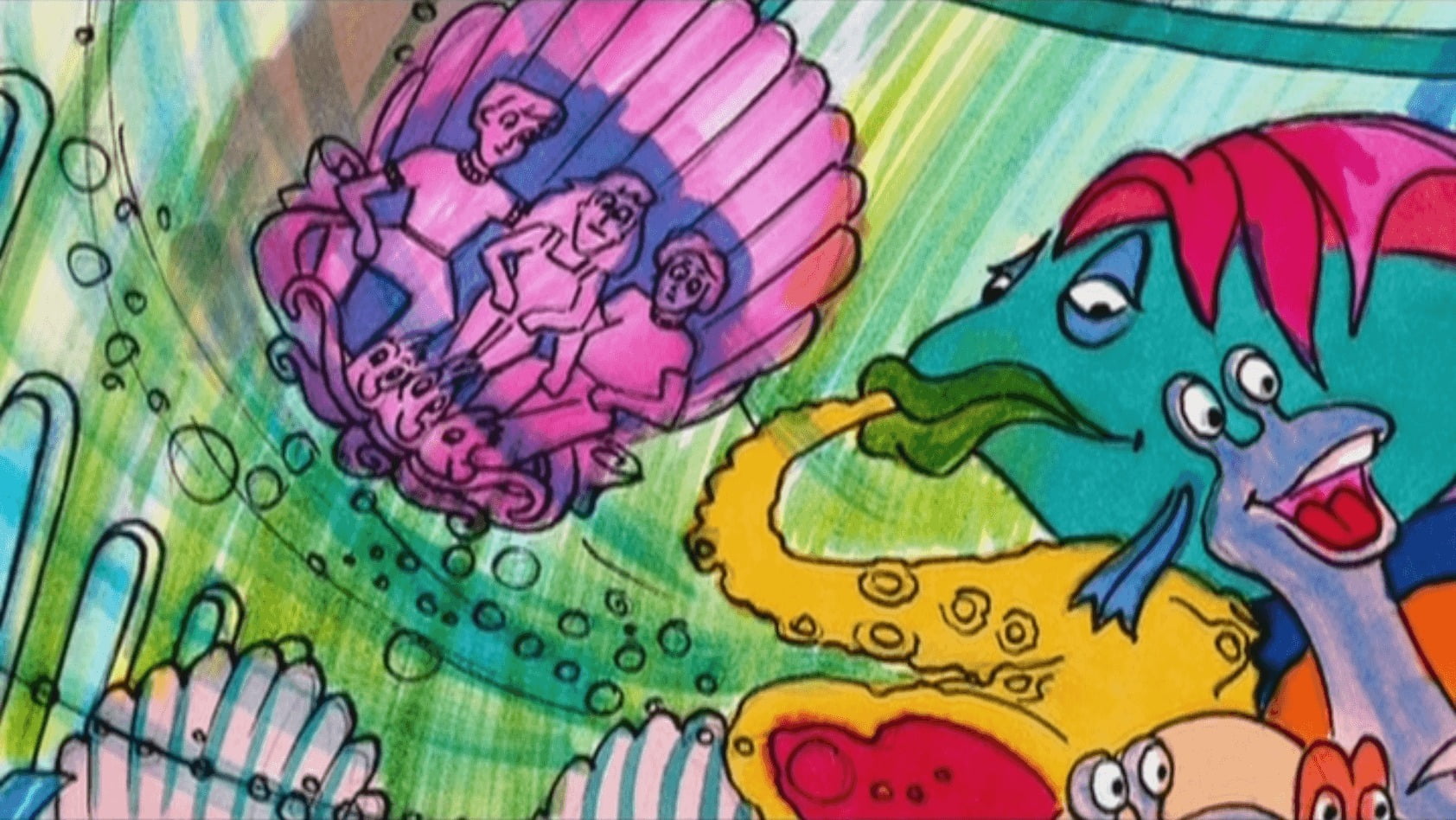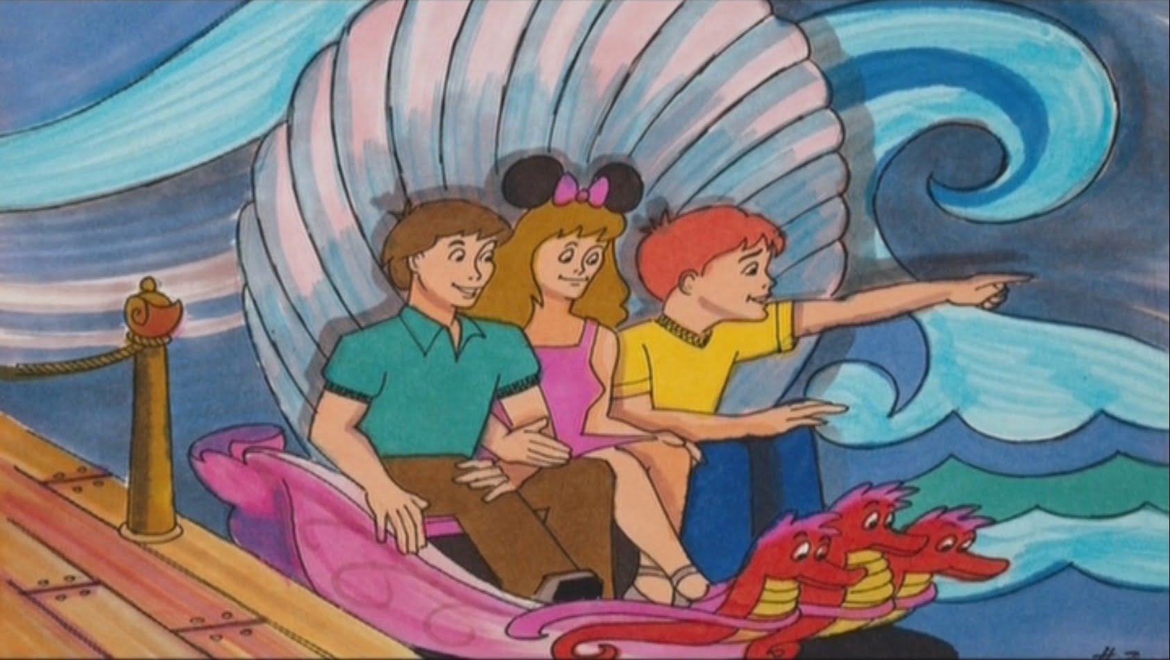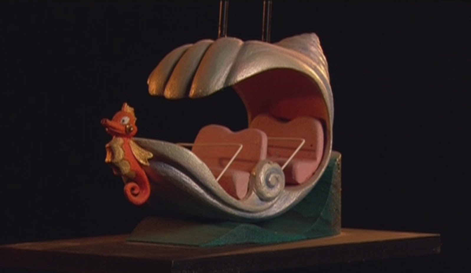 Après avoir sillonné la file d’attente dans les couloirs du château, il est maintenant temps d’embarquer dans l’attraction. Concernant la technologie utilisée, il aurait dû s’agir d’un système de transport suspendu similaire à celui utilisé dans Peter Pan’s Flight. Bien entendu, ici, les bateaux auraient été remplacés par des coquillages géants.