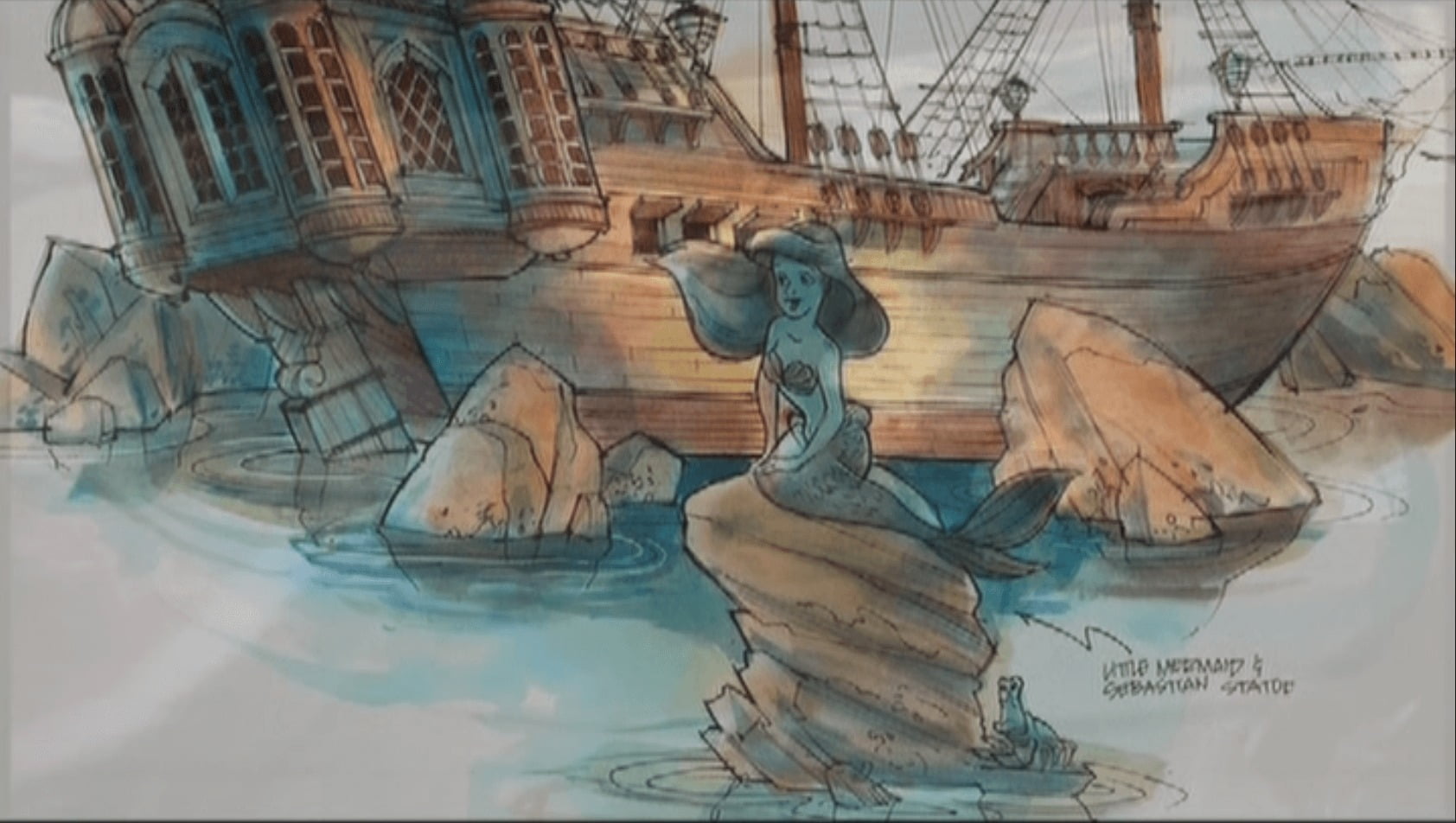 Mais, revenons à l’attraction principale ! Extérieurement, le projet devait reprendre la façade du château du Prince Eric, tel qu’il est représenté dans les films. Nous aurions aussi pu retrouver d’énormes rochers qui auraient permis eux aussi de cacher un bâtiment (showbuilding) assez imposant, de deux étages.