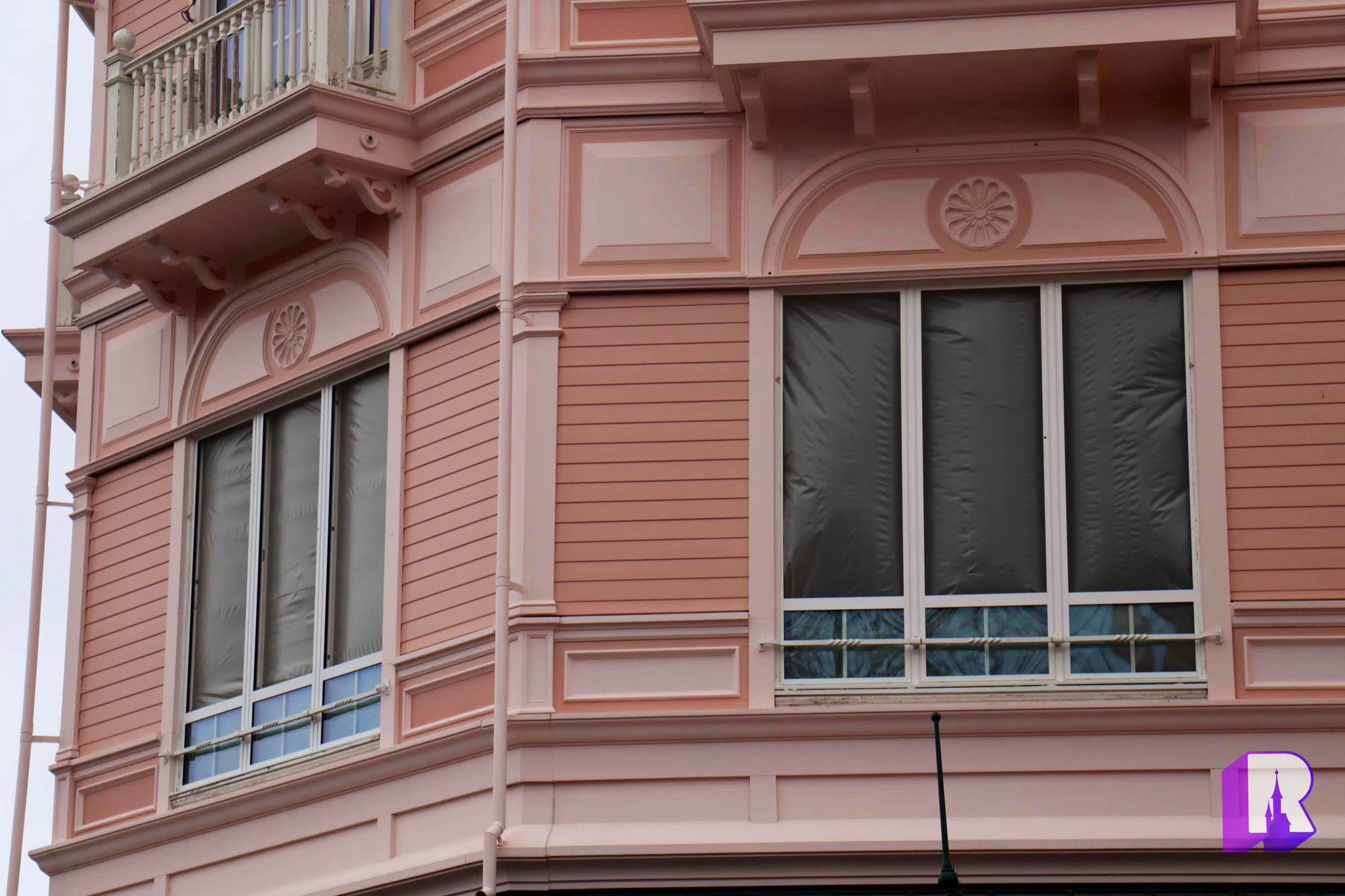 Talking about the Disneyland hotel, a lot of work is still ongoing with over a year to go for the reimagined property to open. Above, we are looking at windows for what used to be Inventions, the buffet restaurant, which is likely to be re-themed to a more royal concept.