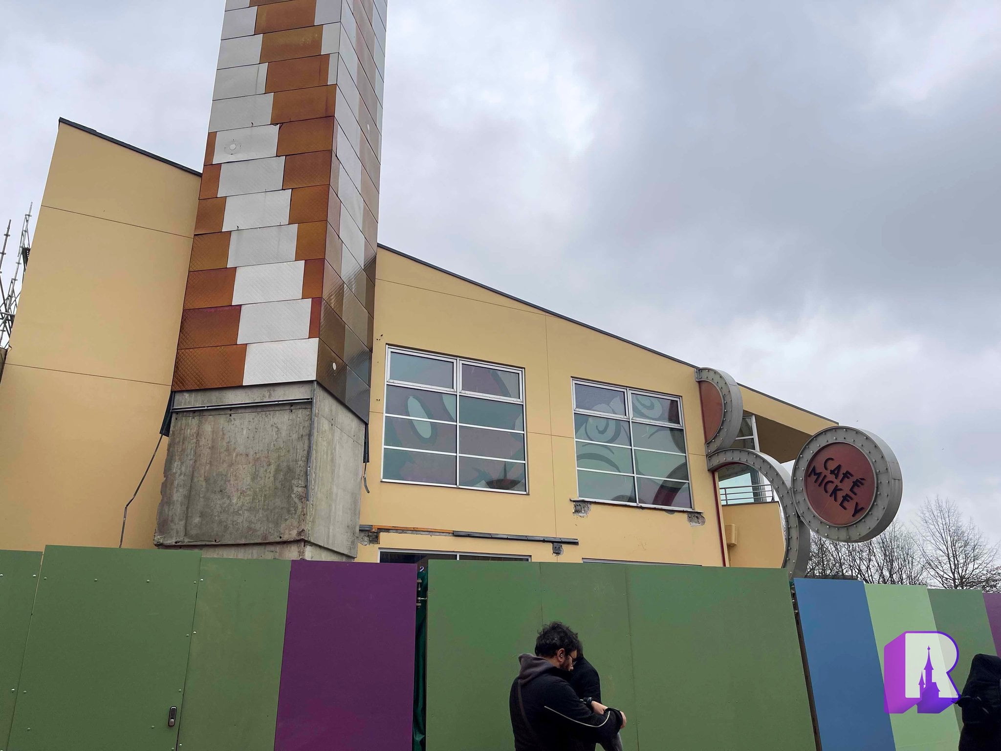 Things are also moving swiftly at Cafe Mickey, as you can see the extended outdoor terrace has already been removed. Scaffolding is going up on the side of the building, and some of the silver and copper cladding has been removed from the pillars.