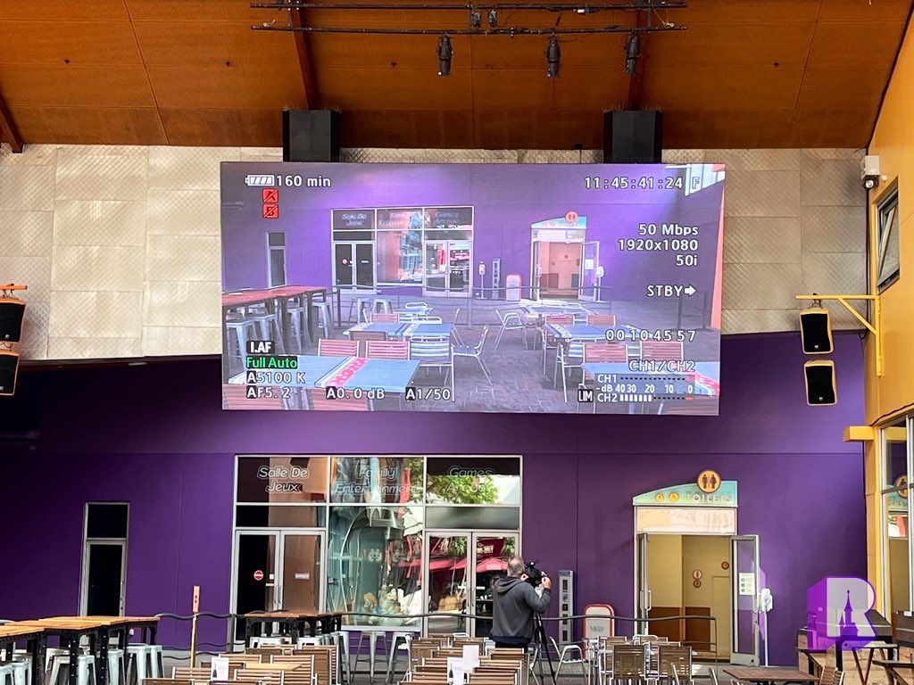 We gotta start with this Disney Village screen broadcasting video of the area right under it. A mystery.