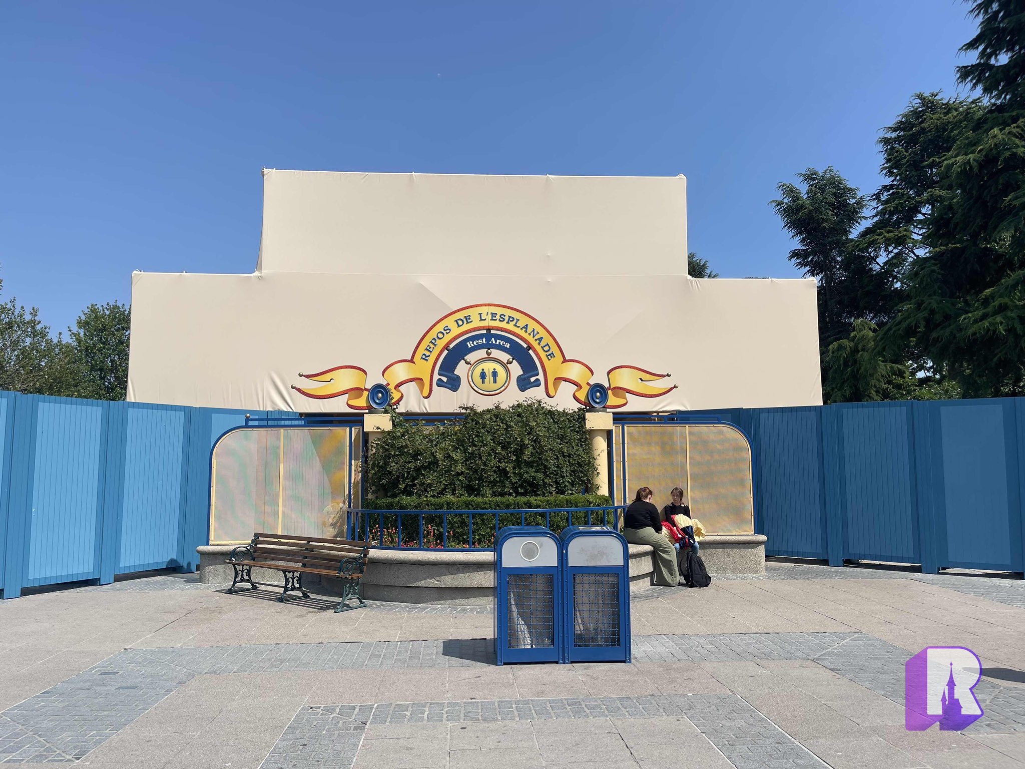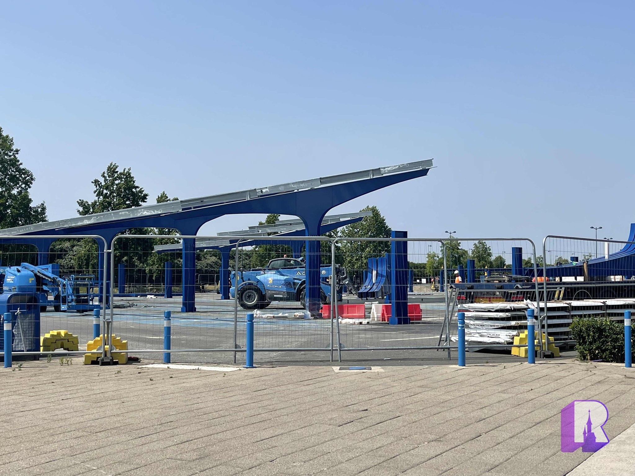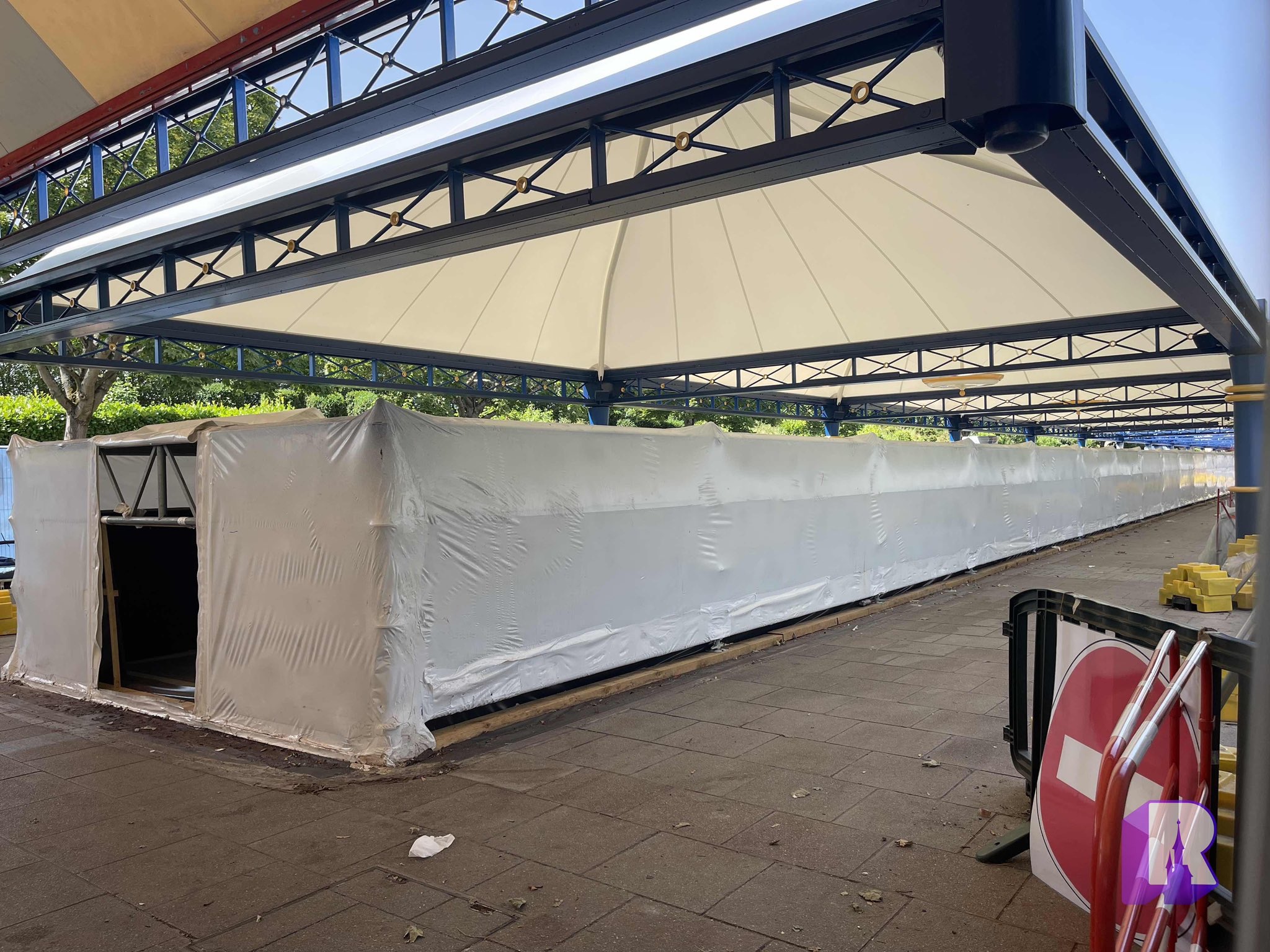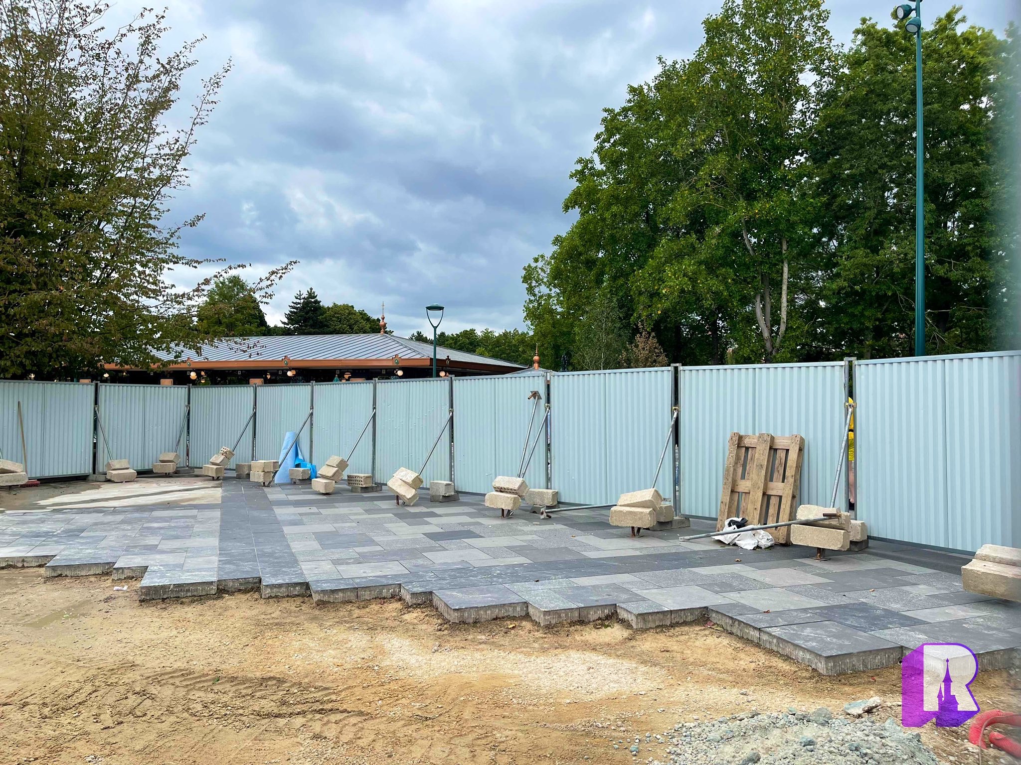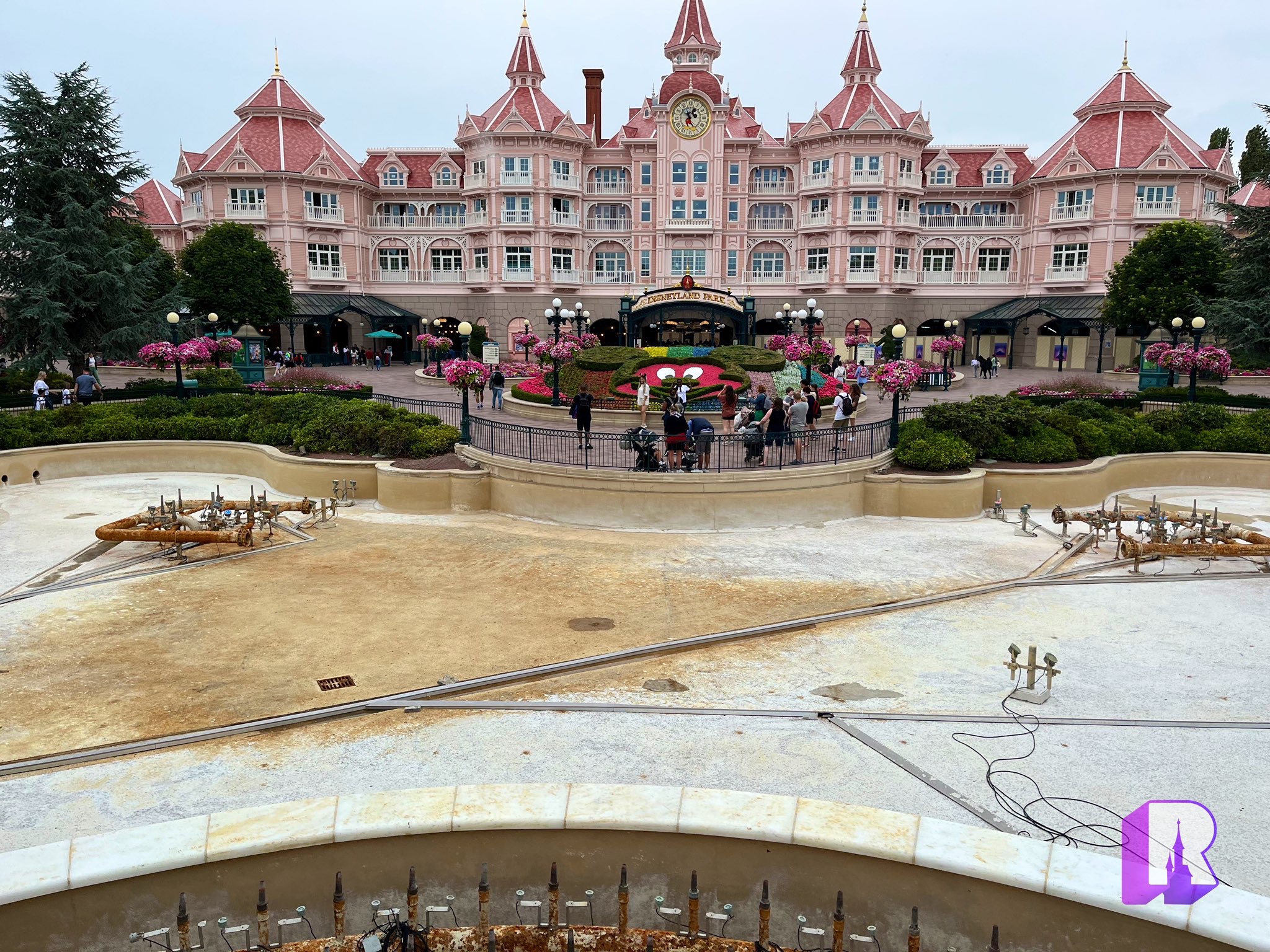 Over in the Resort Hub, resurfacing has now started near the main train station – grey because it’s outside the “magic”. And of course pink-ish inside.