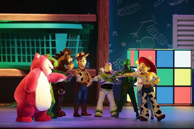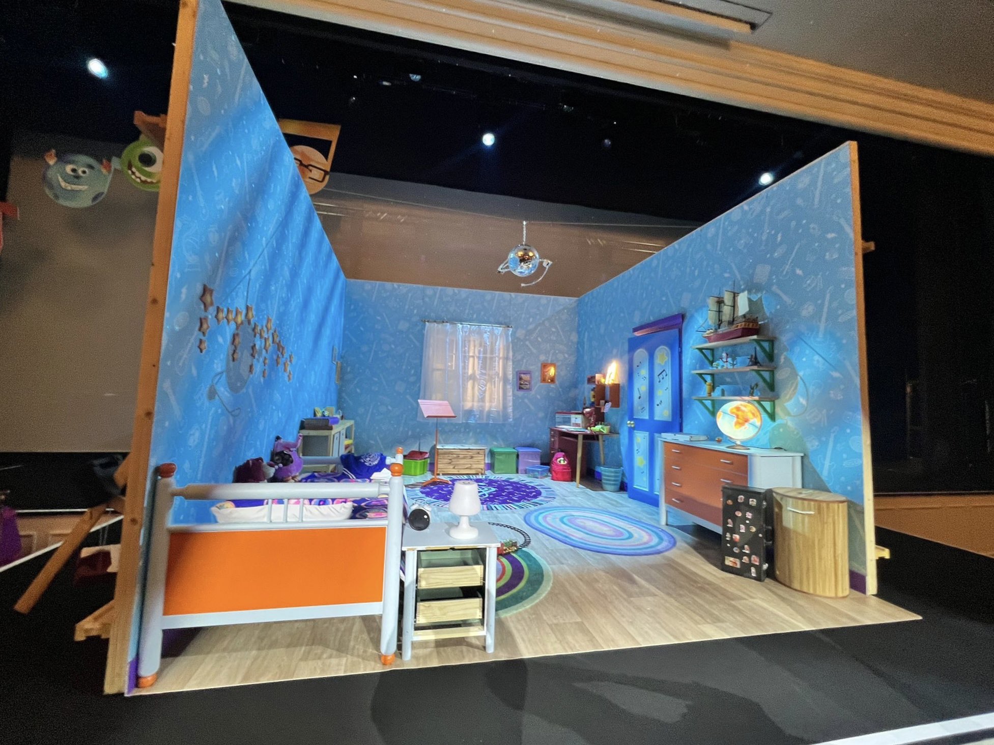 We got the chance to attend the press preview on Saturday, starting in the press room at Disney Newport Bay Club which was one of the most intricate and creative we’ve ever seen. The room represented backstage at the theater with chairs for all the Pixar pals – to scale. The stage showed the back of Charlie’s room – Charlie is the main character of the show around who the story revolves.