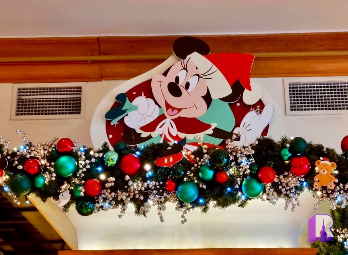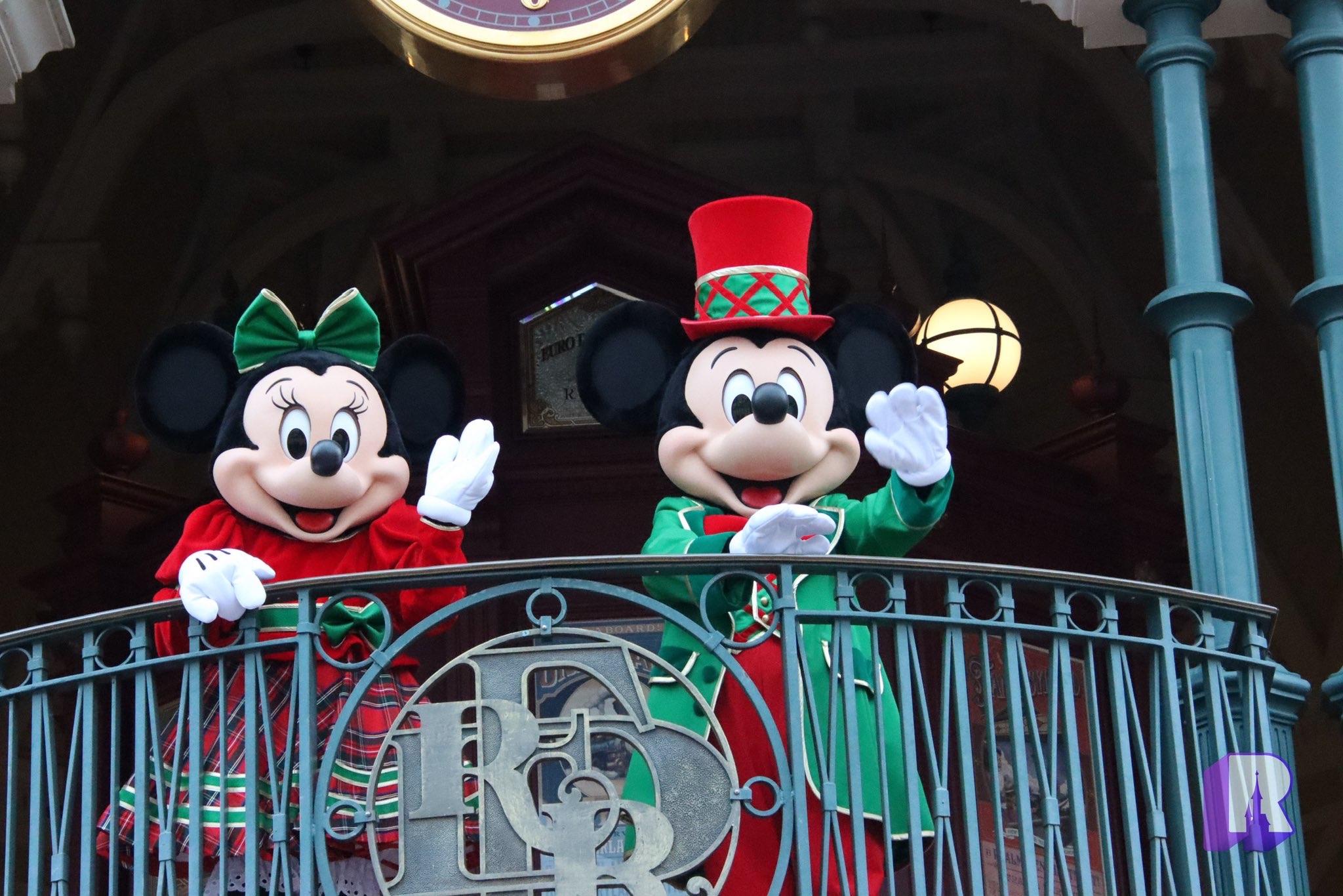 Mickey and Minnie greet Guests each morning on Main Street Station in their festive outfits.