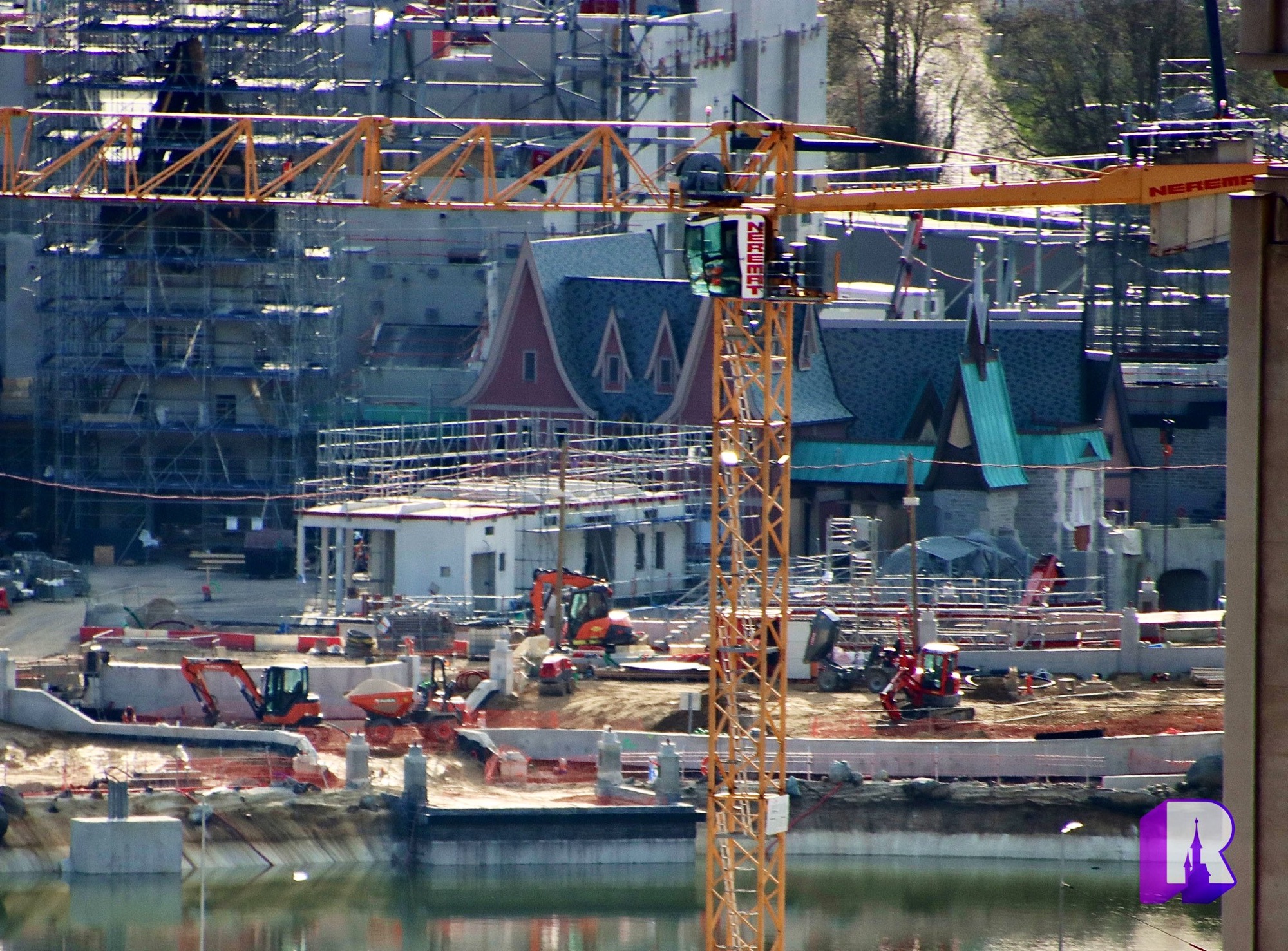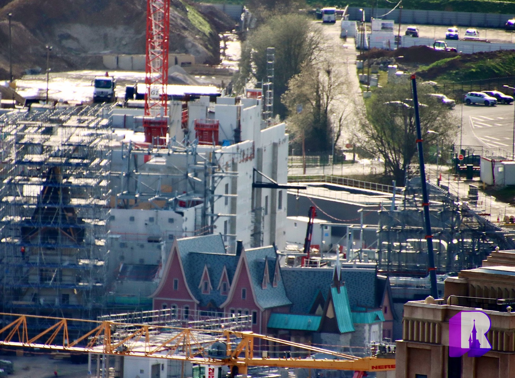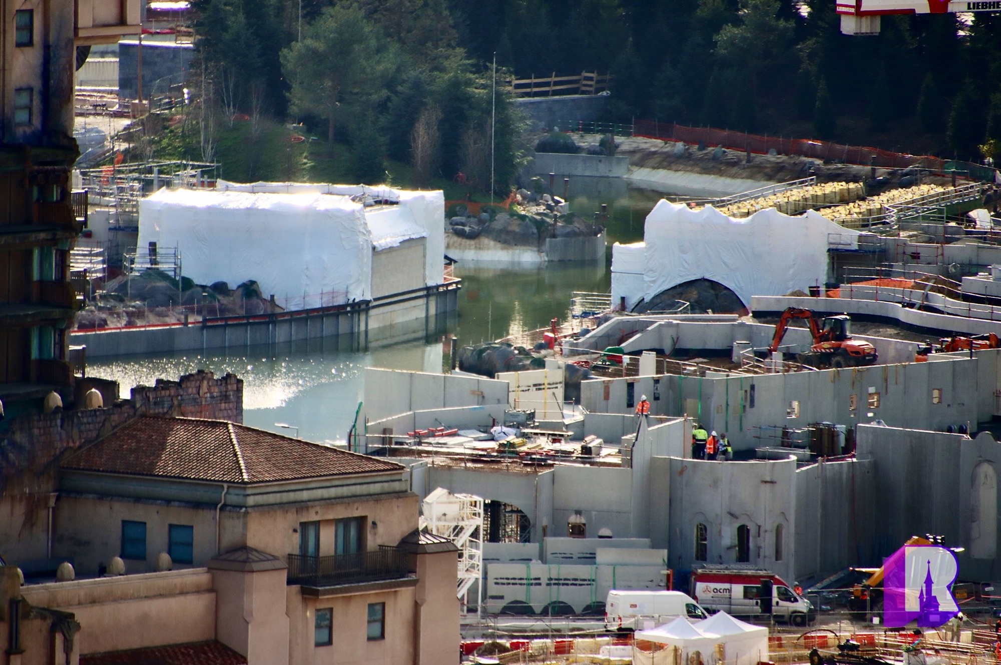 We start with these photos of the Walt Disney Studios Park expansion site where progress is being made on all fronts: Frozen themed land, lake, Rapunzel attraction, lakeside restaurant, landscaped avenue, viewing areas, general theming and place making. Still a lot of work to do.