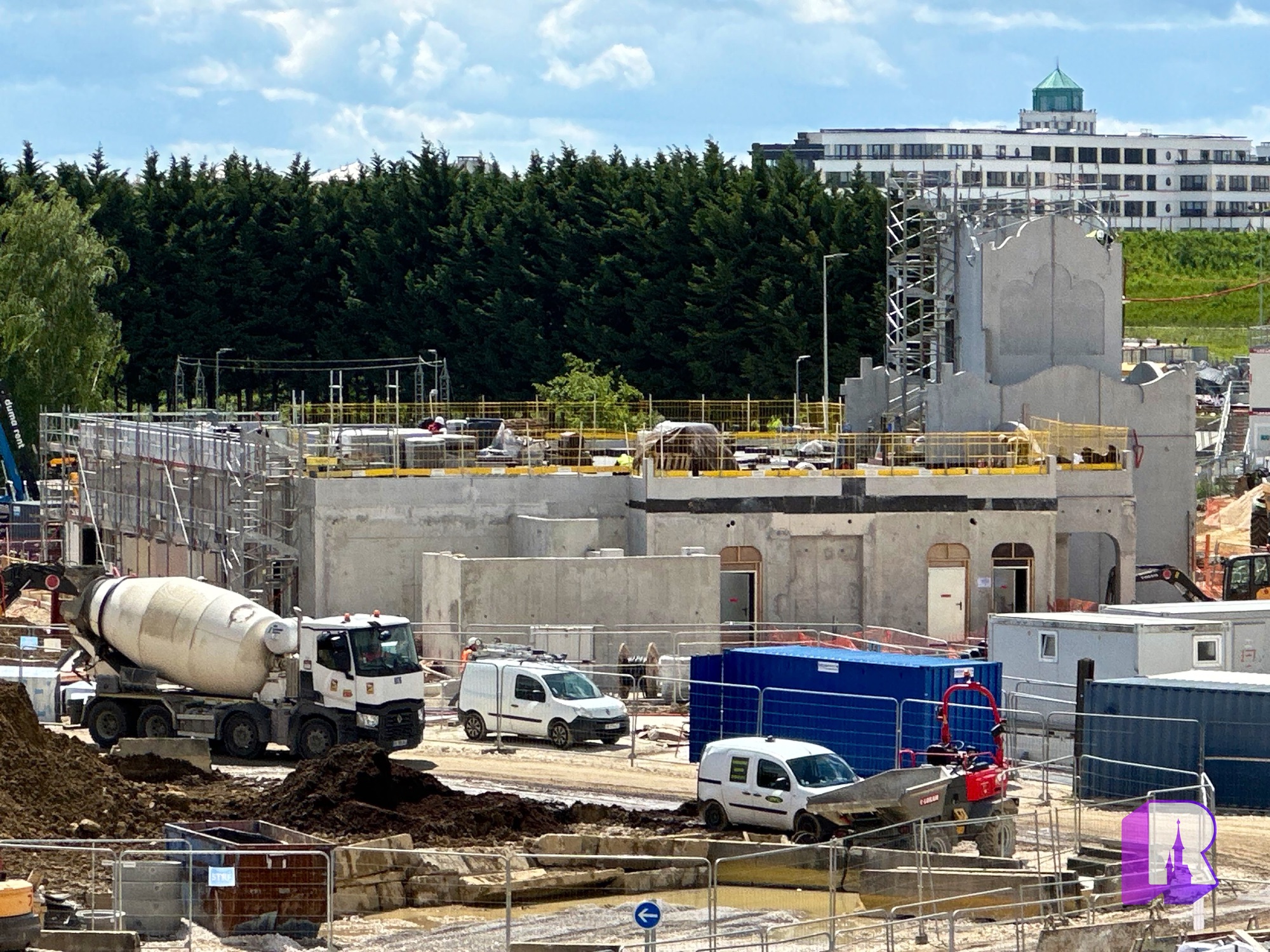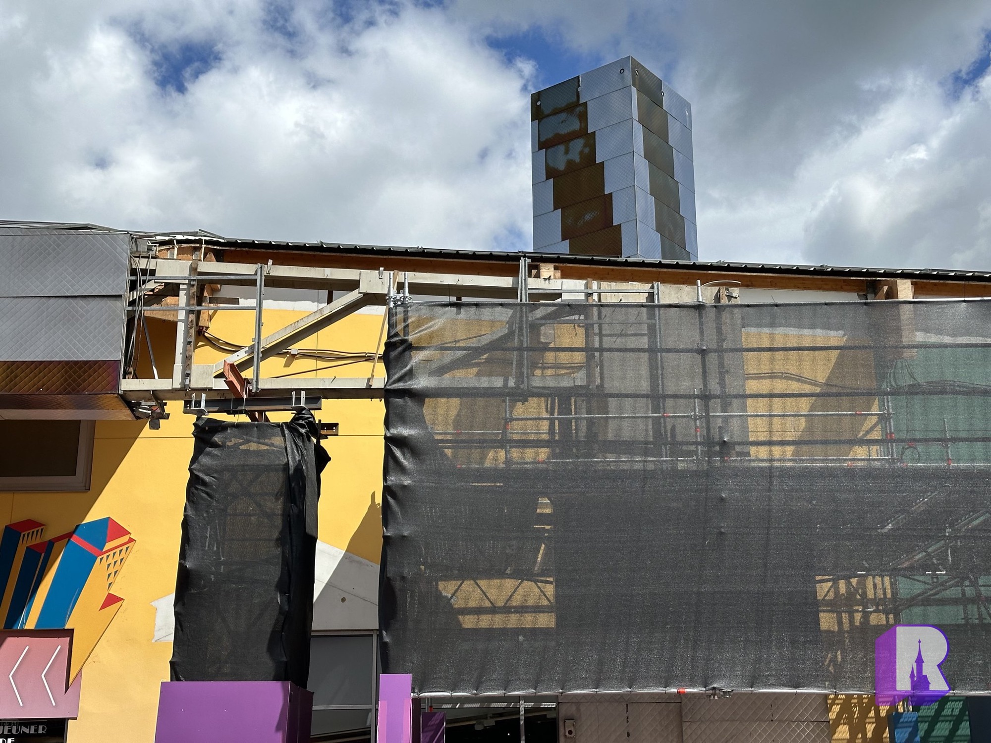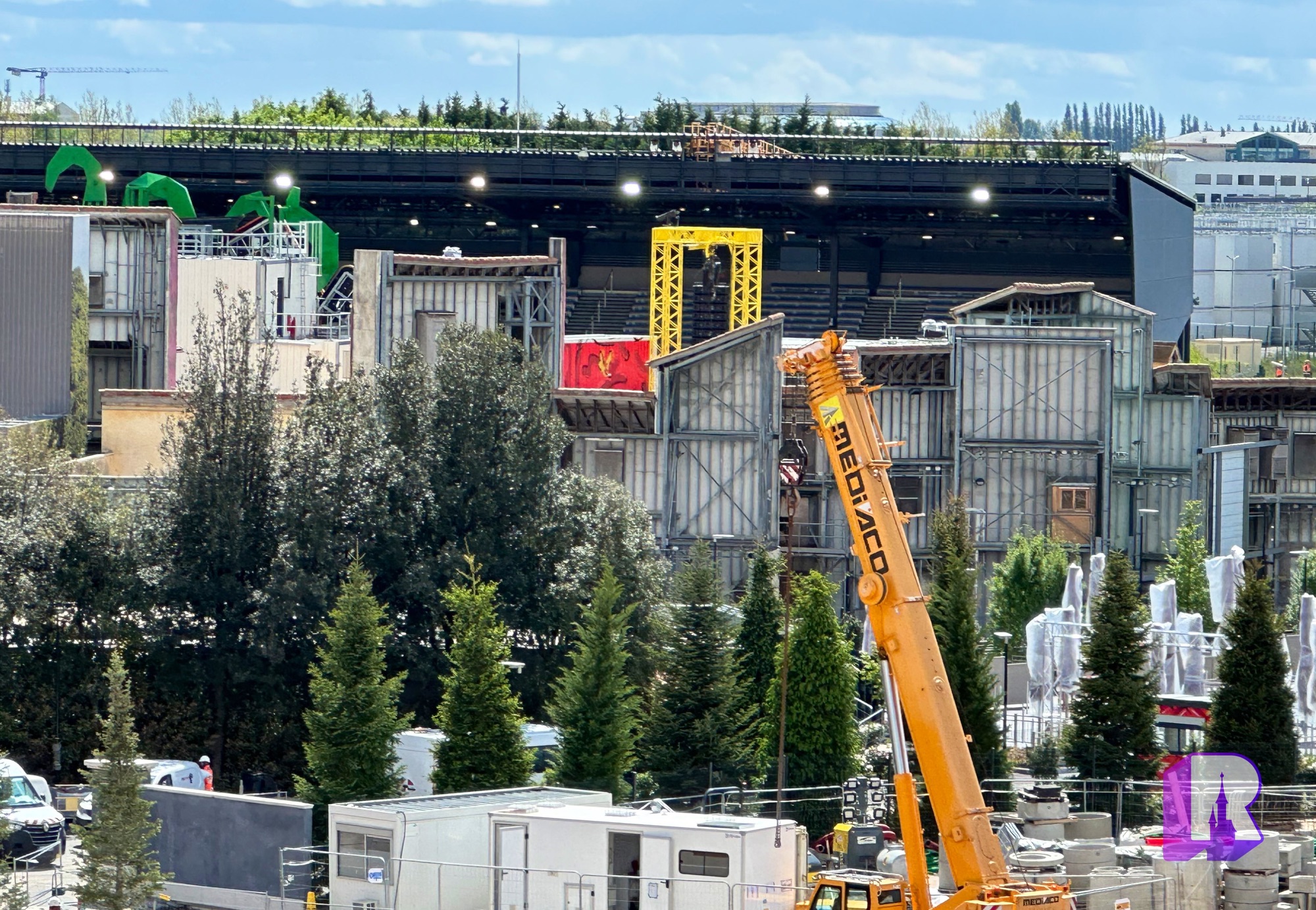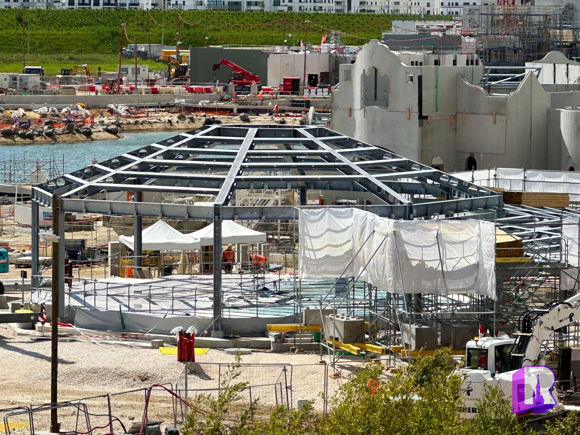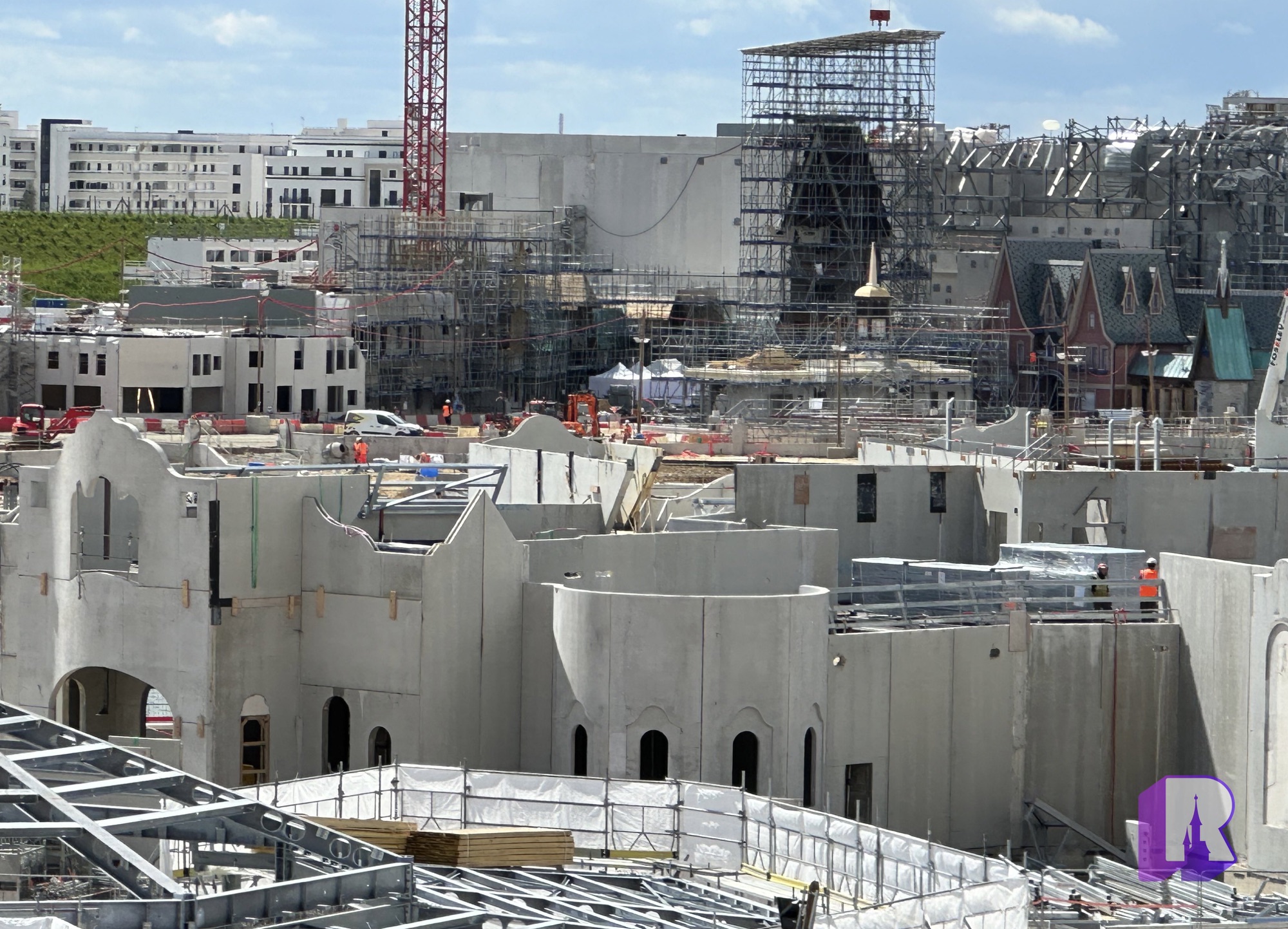 At “Raiponce Tangled Spin”, the main roof structure is complete and awaiting covering, while the queue structure is assembled. Part of the turntable was uncovered, possibly for the first tests of the ride vehicles.
