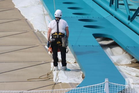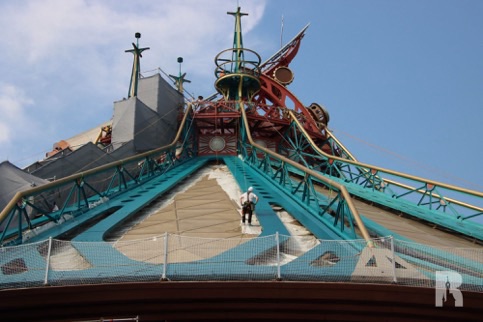 Over at Disneyland Park, painting of the Space Mountain dome has started. It’s being done in phases just using roped up specialists.