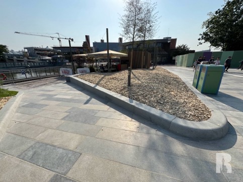 Nearby at Disney Village, some of the railings have arrived, finishing up these planters a little bit better.