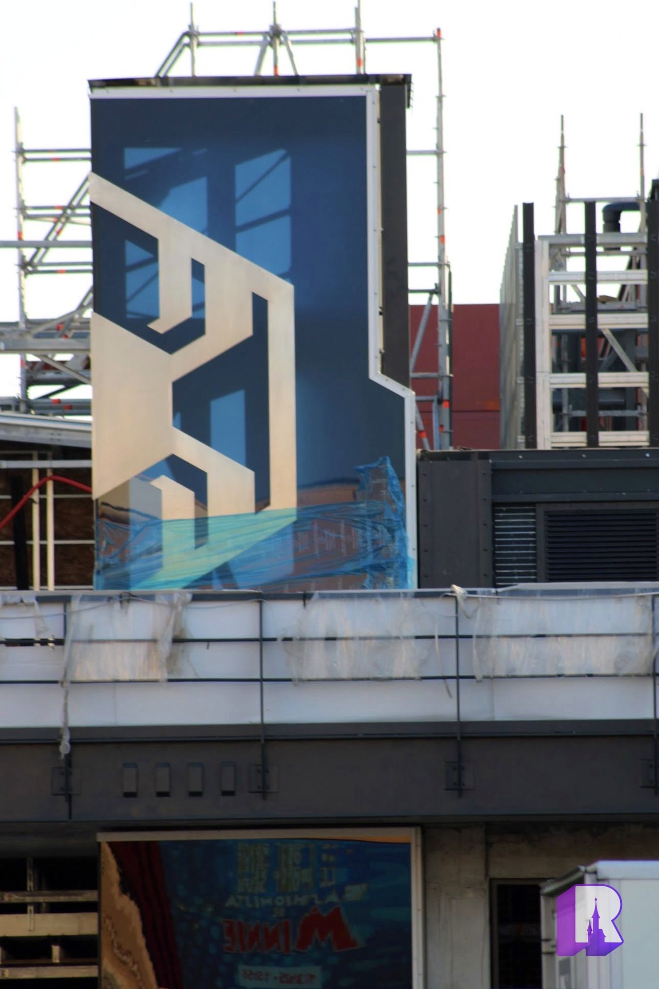 Over at the Spider-Man building, theming continues to be applied, and we noticed new somber panels being added: