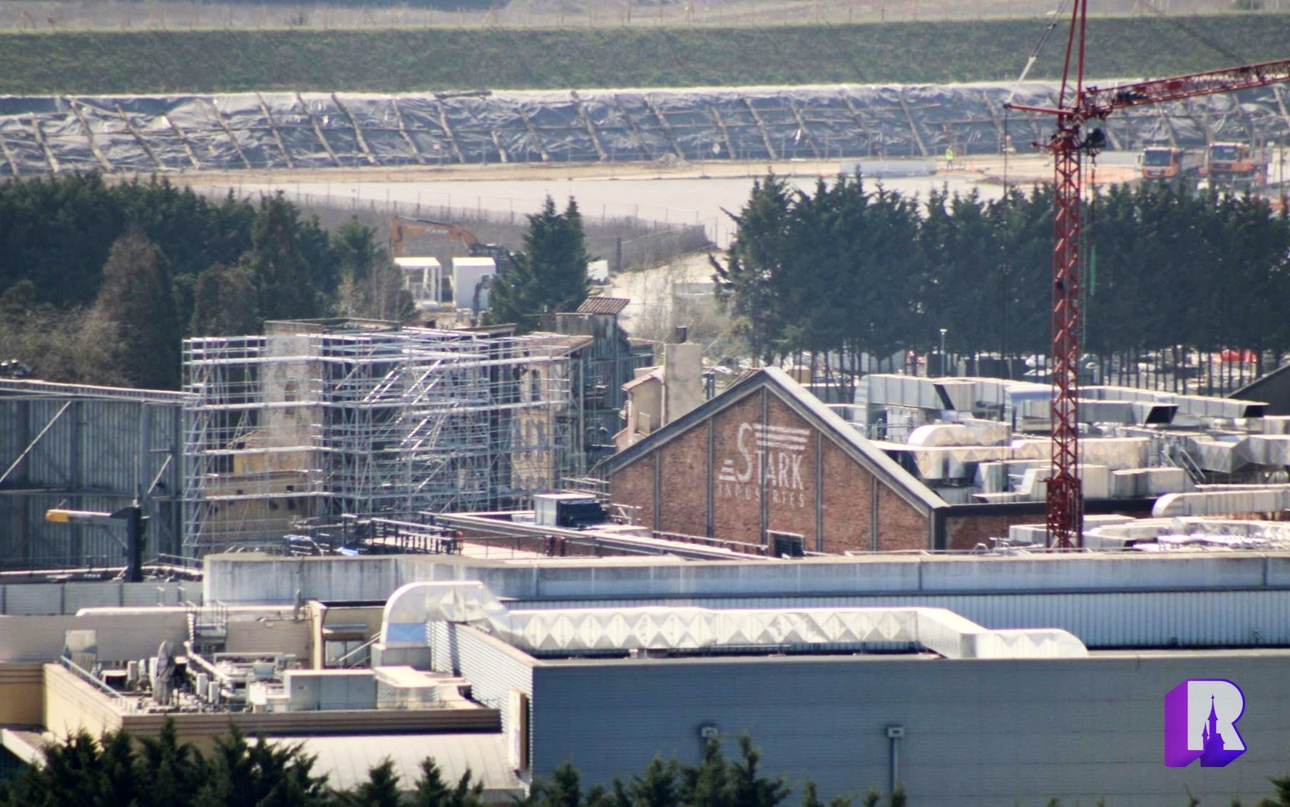 From the sky we could see that the Moteurs Action set will be hidden using a giant tarp hooked to scaffolding. Ehhh.