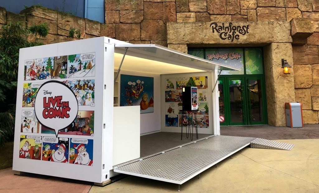 A new pop up location has appeared near Rainforest Cafe at Disney Village, promoting classic Disney Comics. Guests can take a photo in the photo booth and maybe win a comic (many people win). This free promotion doesn’t sell anything, it’s just all for the fun (and promotion) of the books, a great idea to showcase the media to a younger generation. The location will remain until January 4 and opens daily from 4pm: