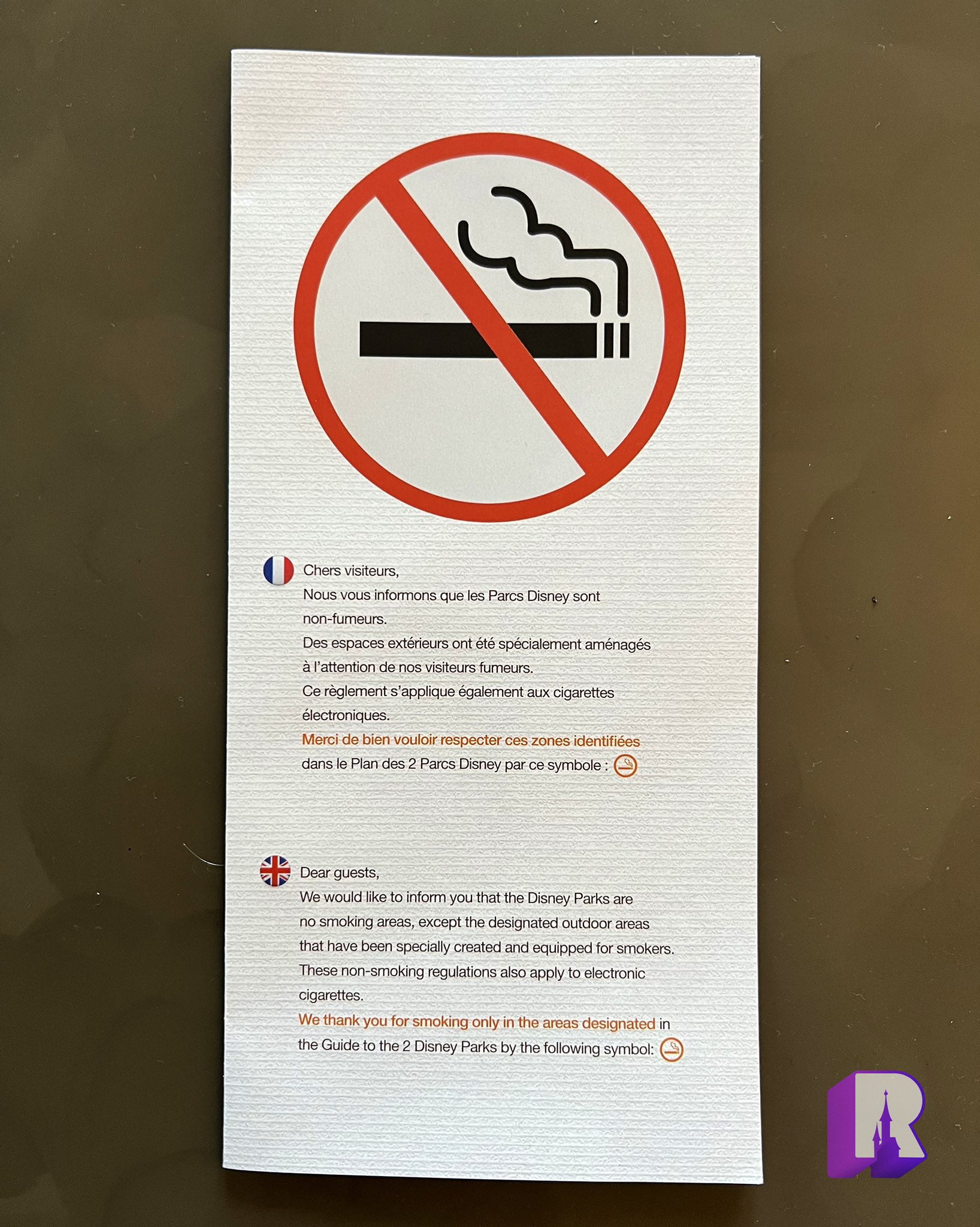 In other news the “don’t smoke here” leaflet was updated with a large no smoking sign and a map of the smoking areas. It’s given by cast members to Guests who break the rules.