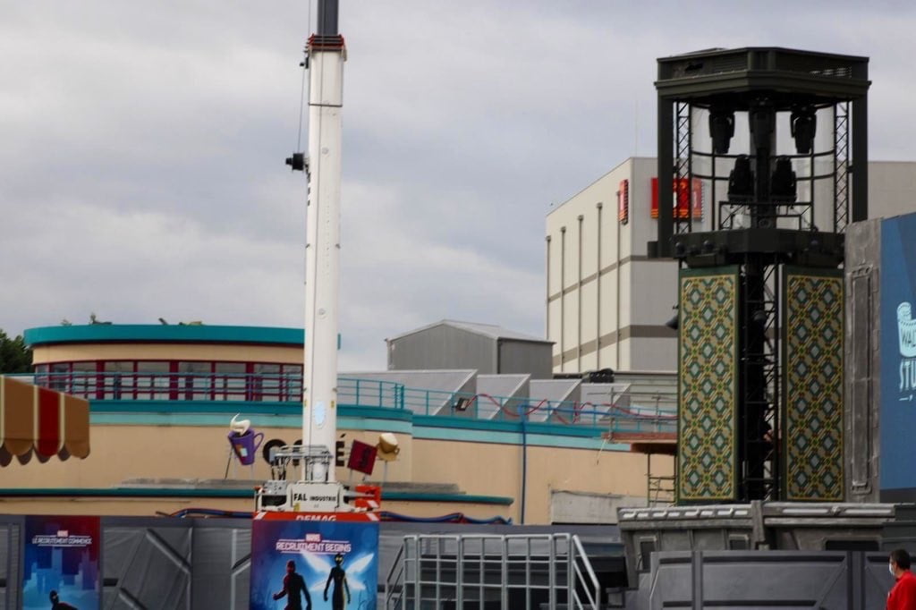 Avengers Campus got a new friend in that smaller white crane helping putting in place sections of the Spider-Man Attraction building.