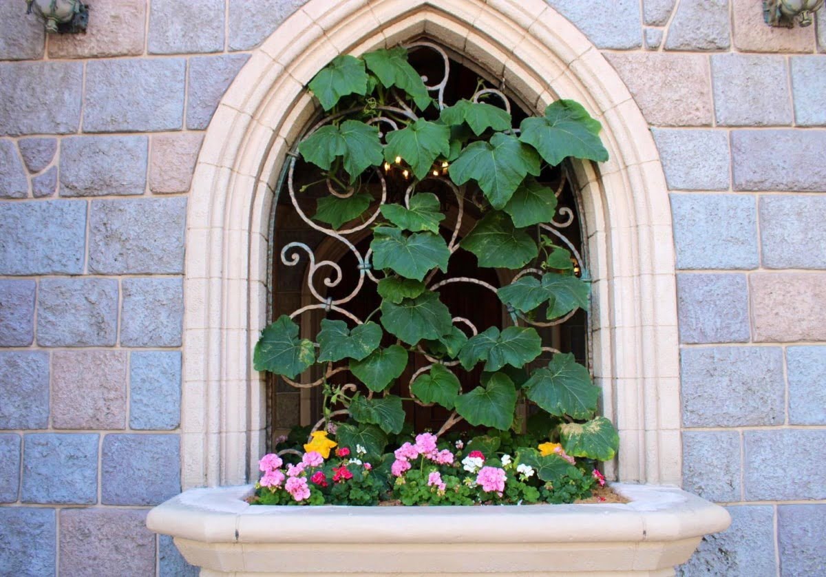 This Sleeping Beauty Castle window was recently updated with squash plants – basically pumpkins!- what a clever and cute nod to the fairytales.