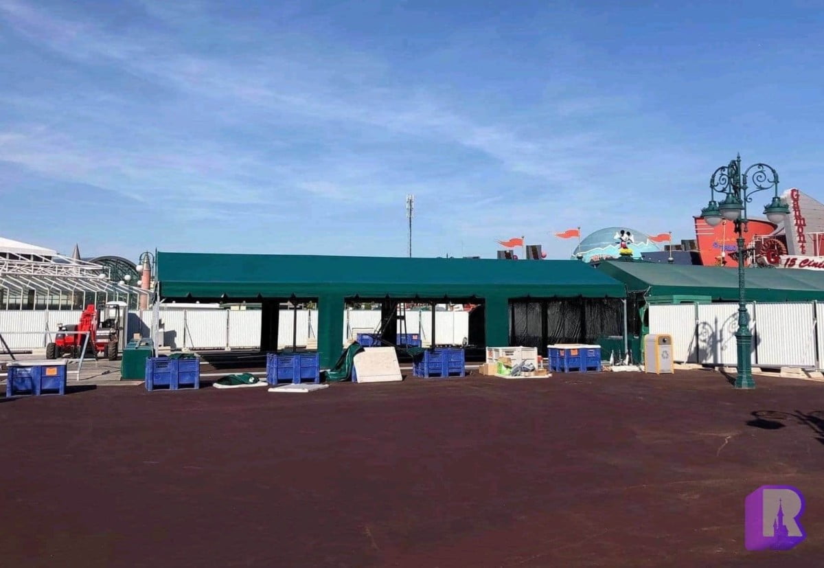 Possibly the fastest thing Disneyland Paris has ever built: the ugly tarmac was poured and the boring tents installed in just a week for the expanded security area. It looks terrible but there’s hope that Disneyland Paris still has proper paving and « built up » security canopies planned down the road – a road that might be as long as the Disney Village remodel but don’t get me started with that.. breathe.. think happy thoughts.