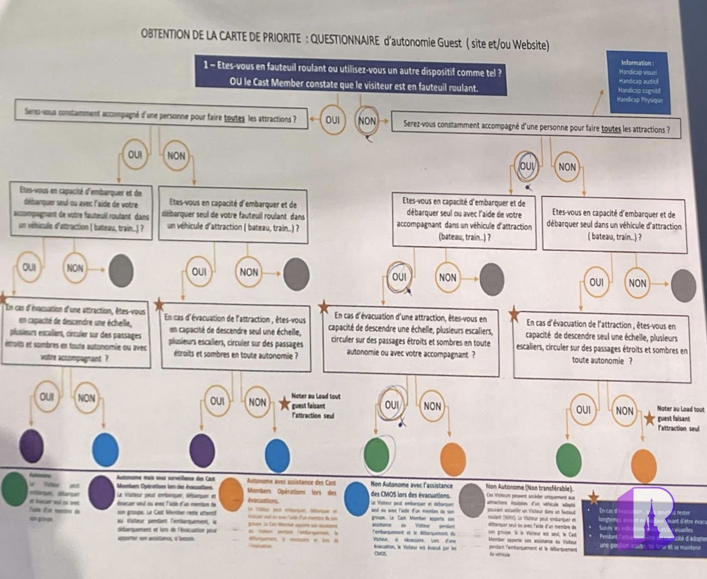 Above is a look at the new “question tree” Guests must fill either in person or online in order to obtain a Priority Card (green color) or Easy Access Card (all other colors).