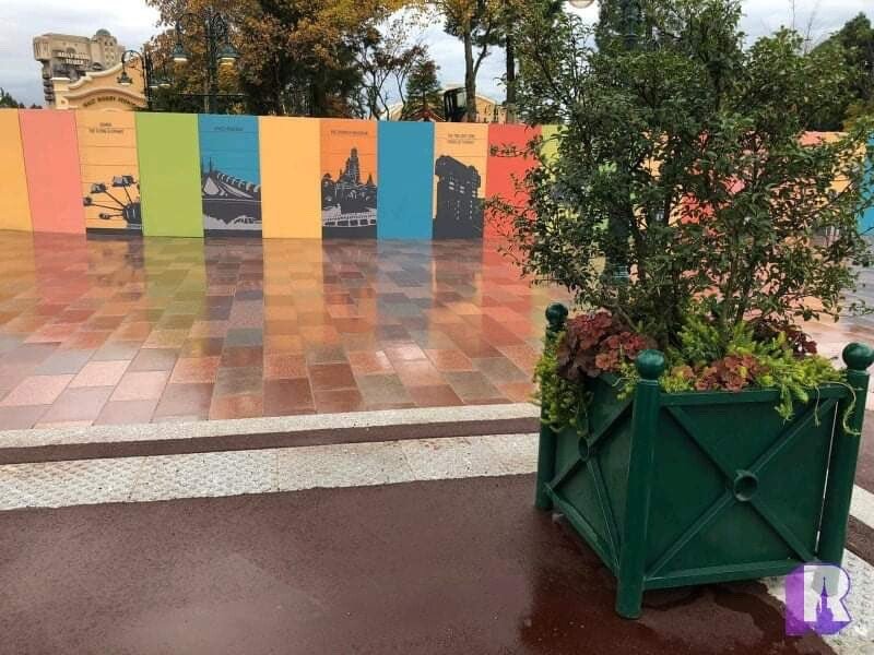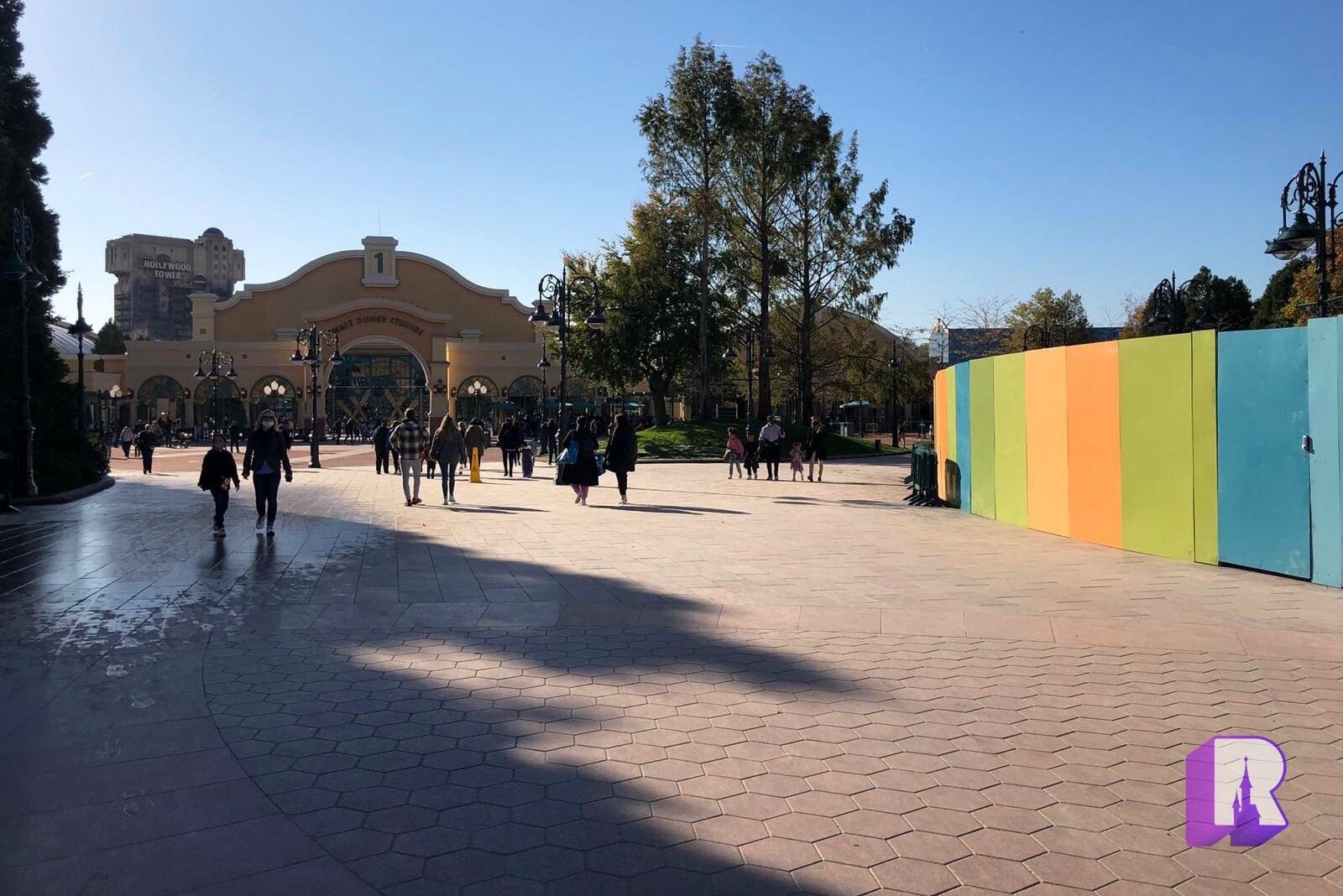 Walls have moved back in the Resort Hub, revealing a big chunk of resurfaced and remodeled entrance area for Walt Disney Studios Park.