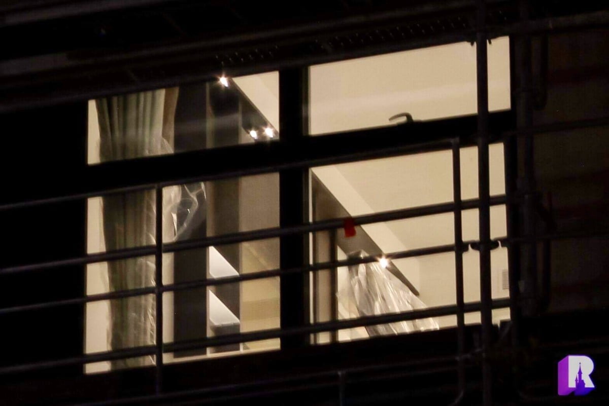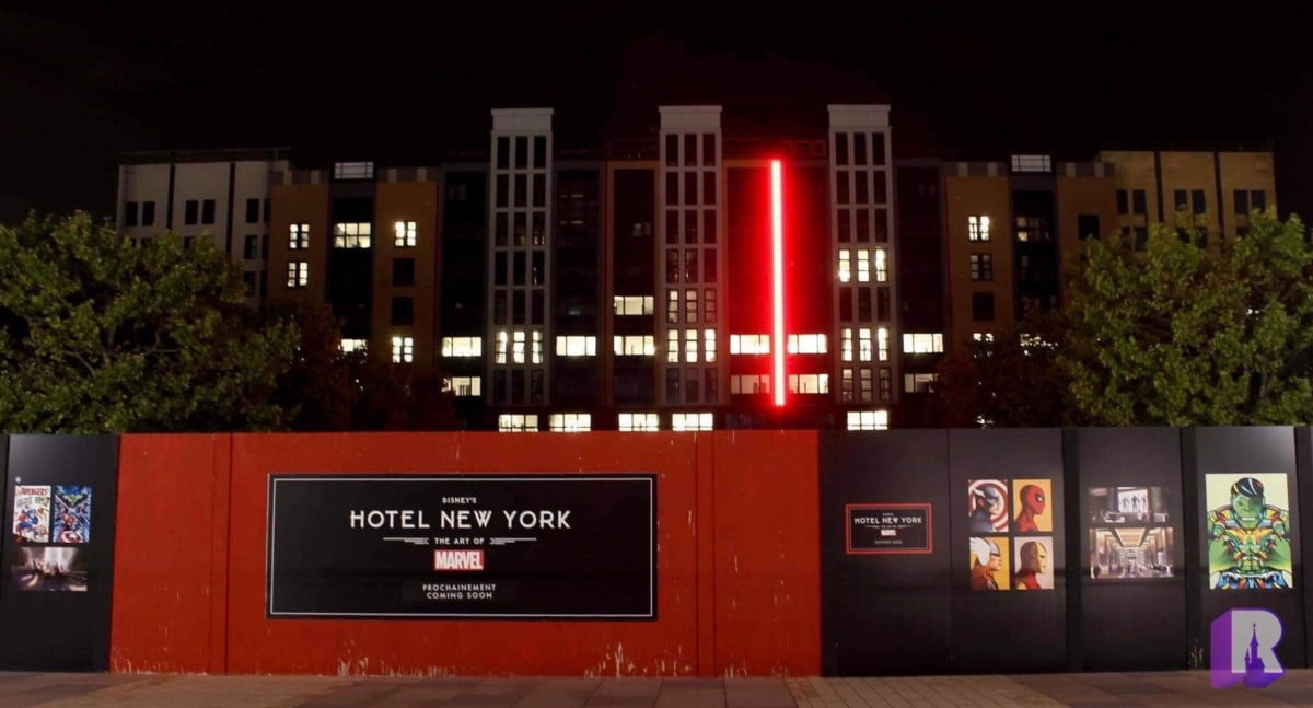 By Lake Disney, a long red LED strip is in testing at Disney’s Hotel New York, the Art of Marvel: