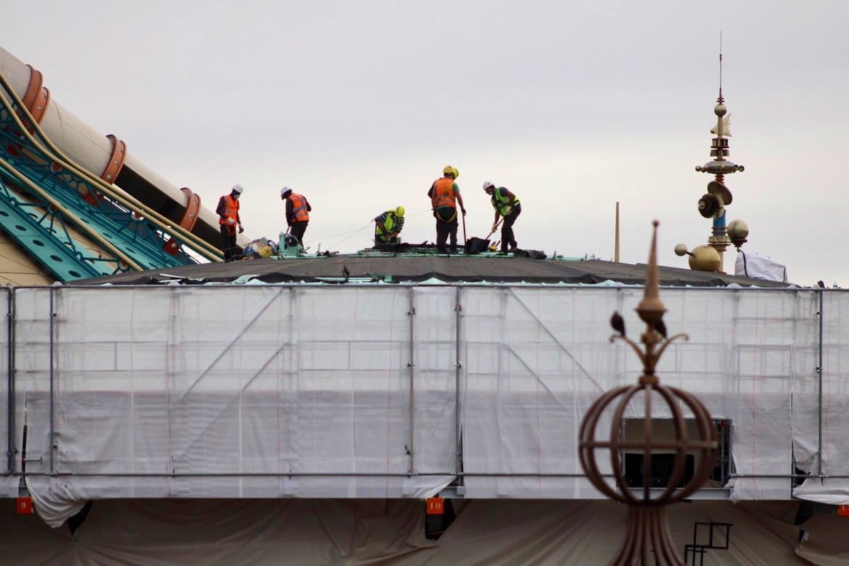 At Buzz Lightyear Laser Blast, works happen mostly behind the tarps on on the roof, but some theming elements could be seen outside from Orbitron.