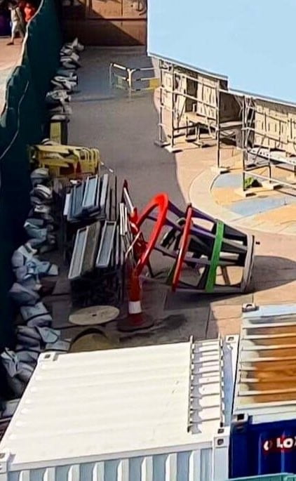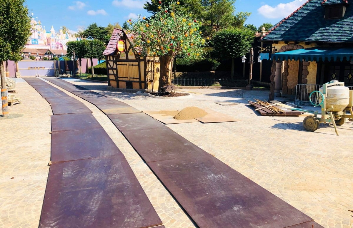 We’re eagerly waiting the opening of the resurfaced area near L’Arbre Enchanté. Pavers are largely done and panels were seen on the ground for trucks to go by at night.