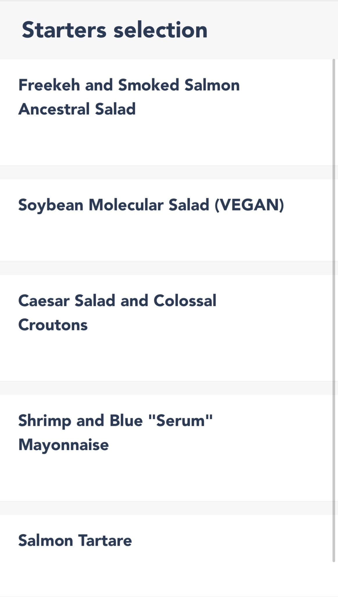 Menus were also revealed and it’s a bit hard to really tell what is what until we see it. The idea is to have one big version of the item and then a number of tiny versions. The buffet is priced at €43 without drinks.