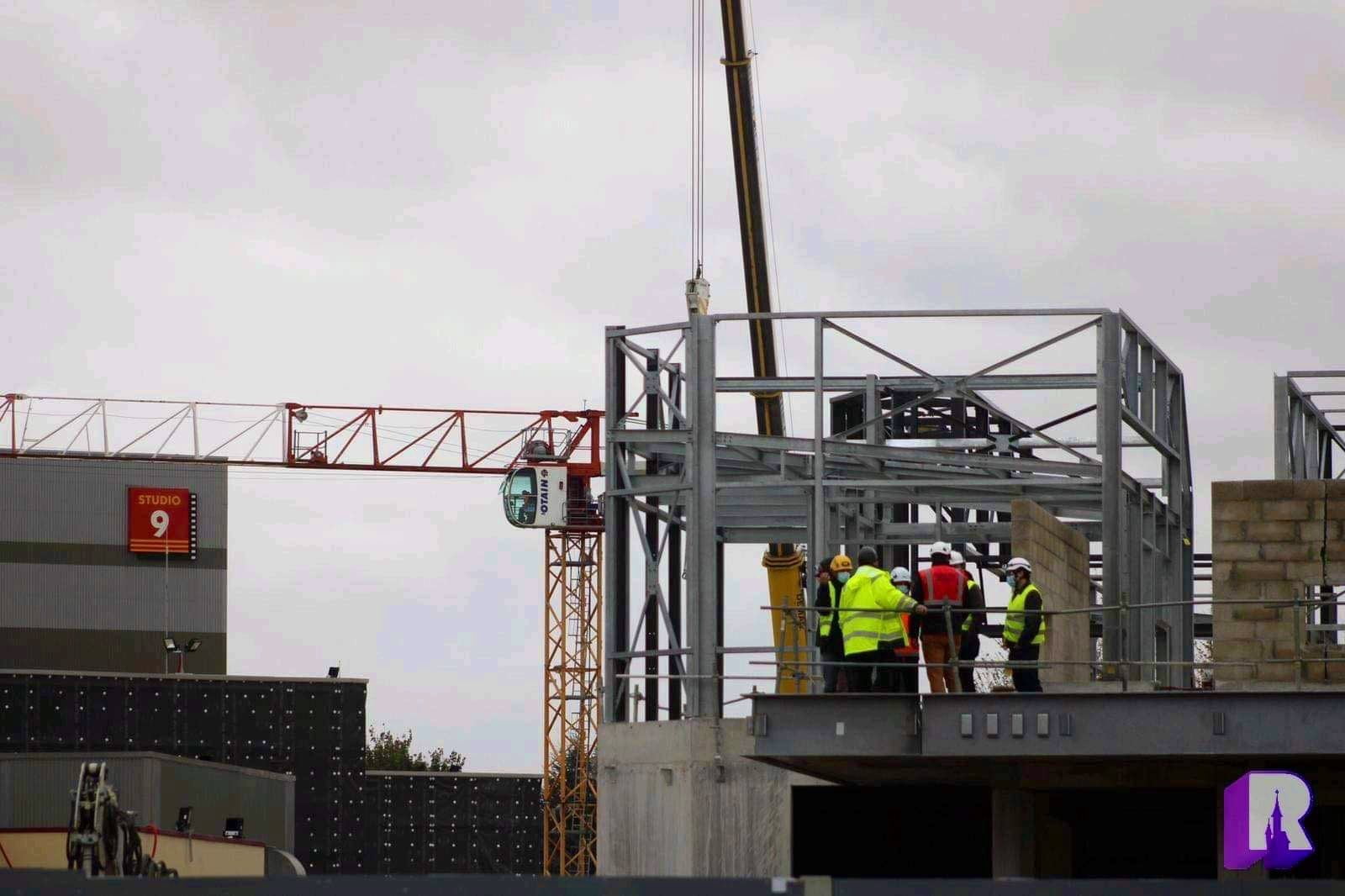 At Avengers Campus, construction continued on all the show buildings, with engineers meeting up on site: