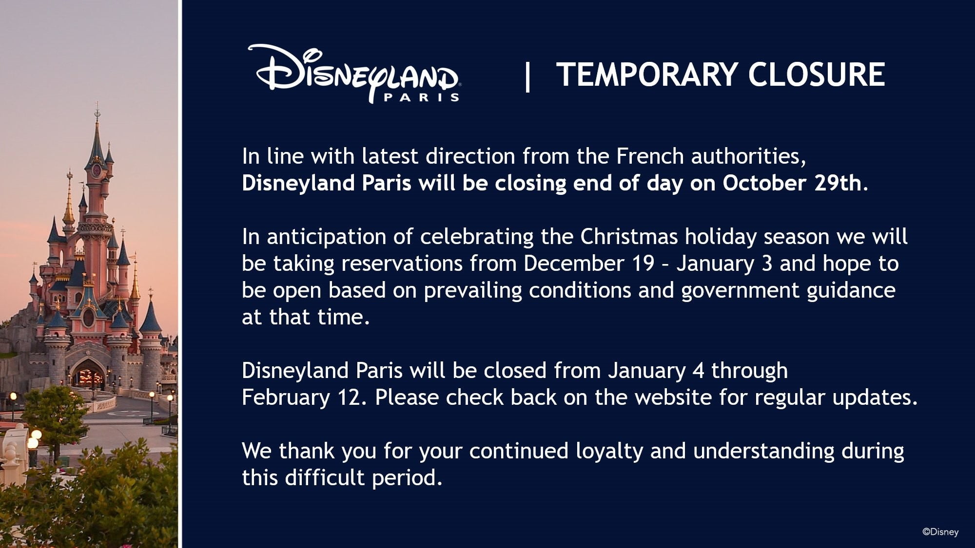 News from Disney officially came Thursday morning with a bit of a twist: Disneyland Paris is closed until February 12, 2021 BUT a window is left open between December 19, 2020 and January 3, 2021 to MAYBE operate for the Christmas holidays.