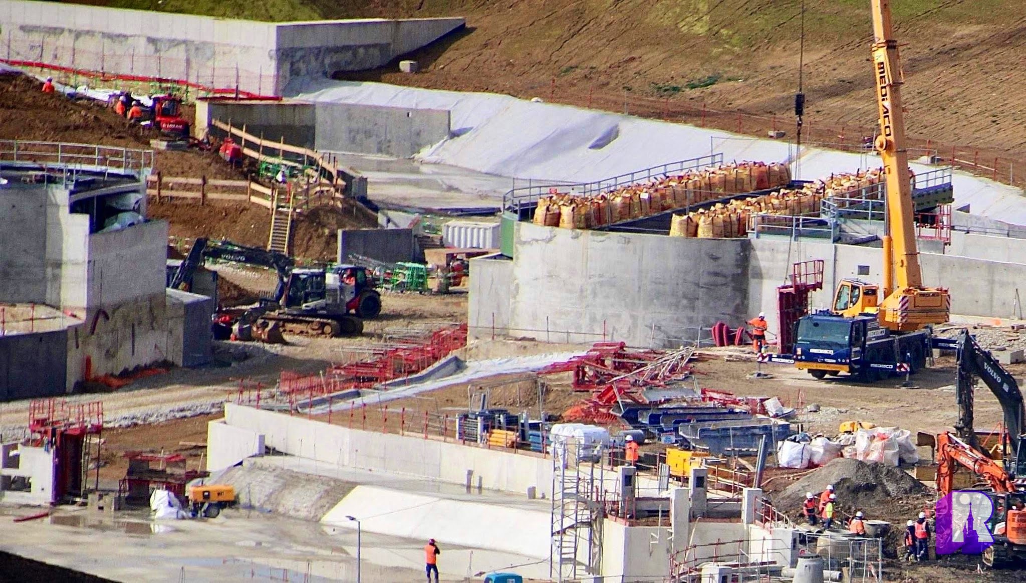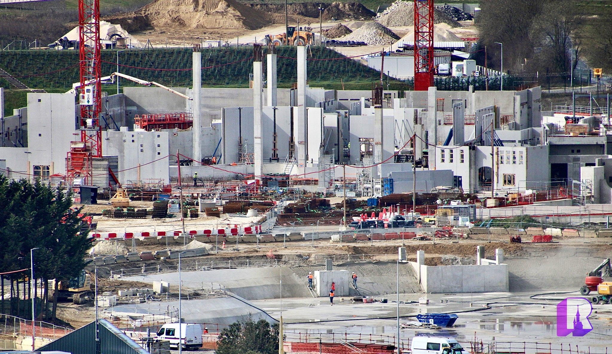Taking a look for ourselves at the Walt Disney Studios Park expansion project – lots of changes each week ! We can now clearly see the rotating bridge weight testing, the outline of the shop and dock and even what seems to be canals for the ground floor of the attraction!