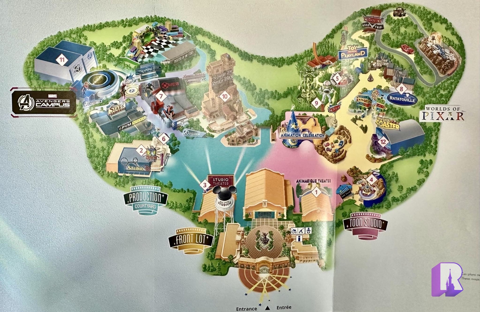 With all these changes, the Walt Disney Studios Park Map has been updated in some hard copy materials: the Studio 1 logo and Partners Statue have disappeared, Hollywood Blvd. is shorter, no cardboard buildings, and the Theaters of the Stars logo has been added as well as the “Alice and the Queen of Hearts: Back to Wonderland” stage (flipped).