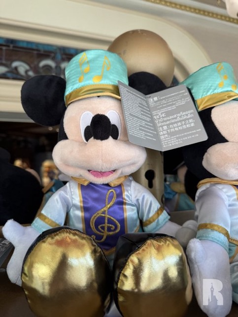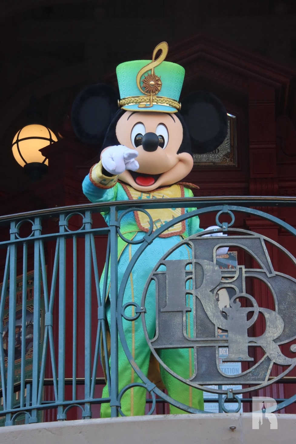 In the morning, Mickey in his Disney Music Festival outfit greets guests from Main Street Station.