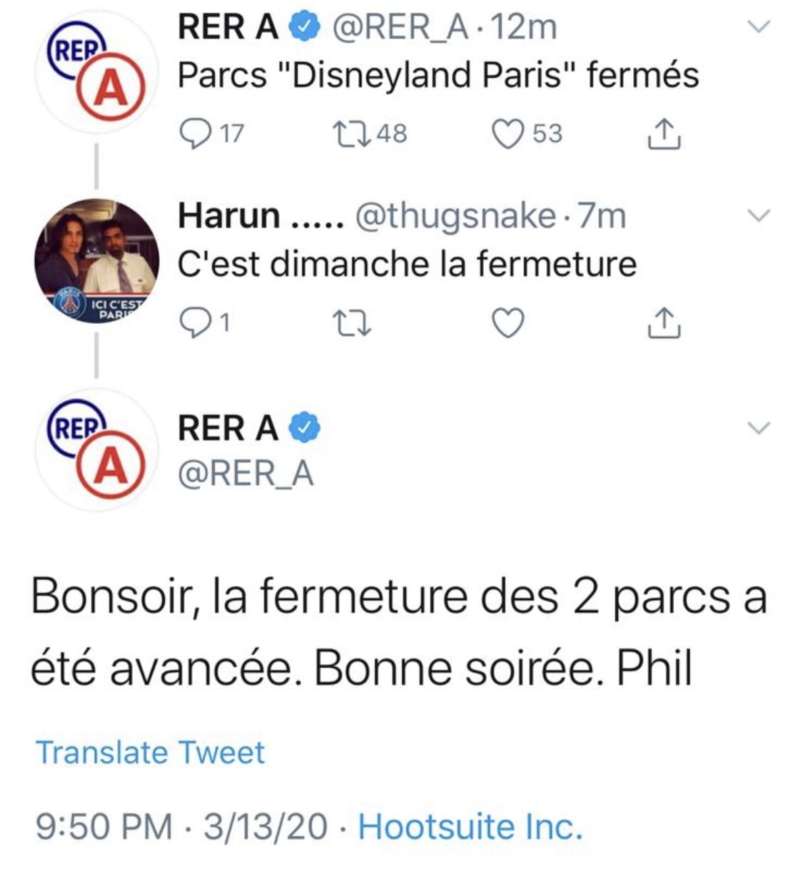 Second shock: Paris train company RATP announced via a tweet reply (why not) that Disneyland Paris would be closed the NEXT day, Saturday March 14 due to the overall conditions in France worsening quickly: