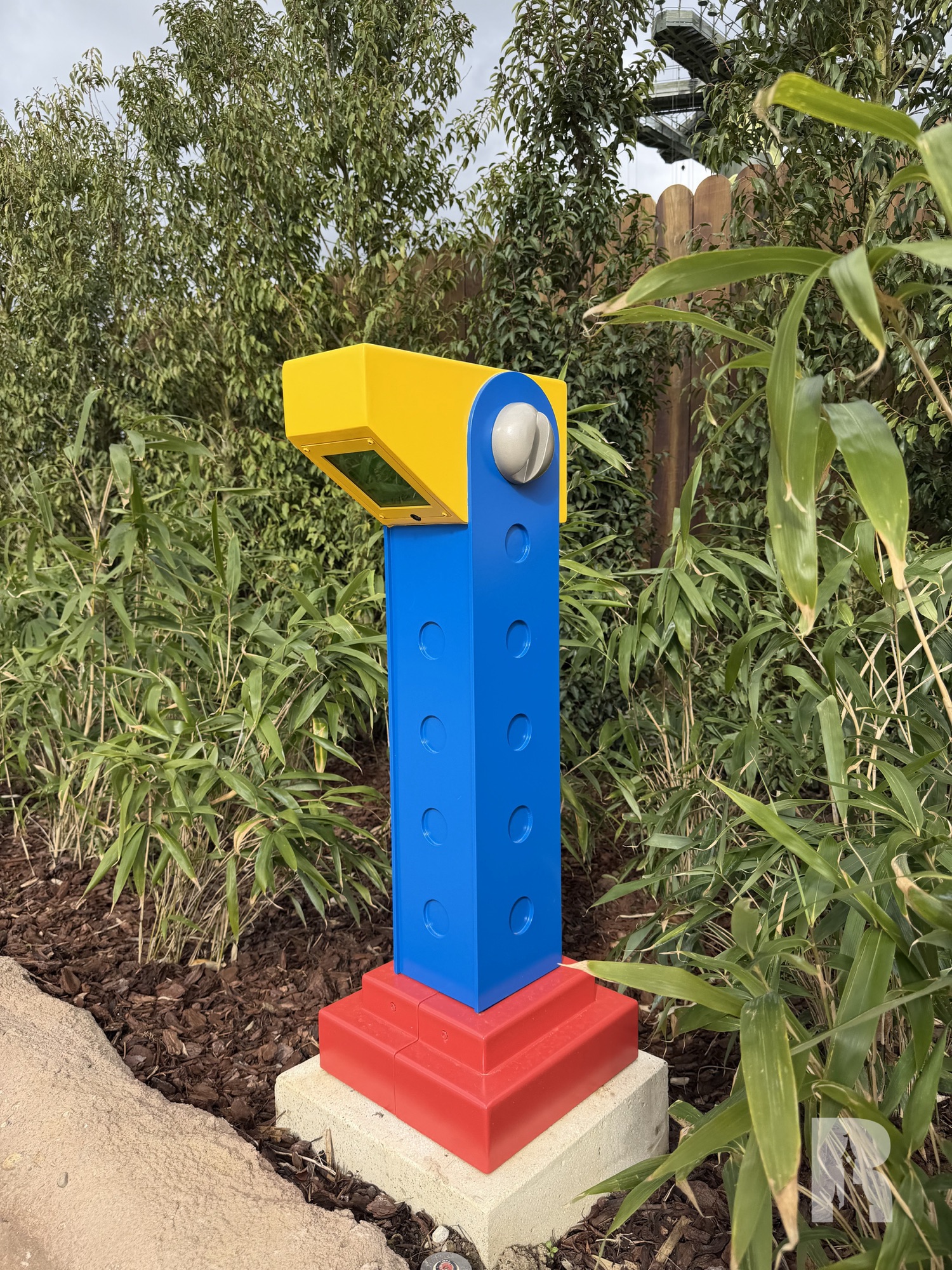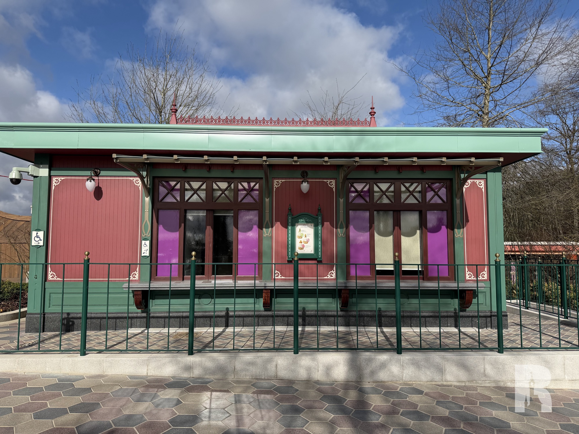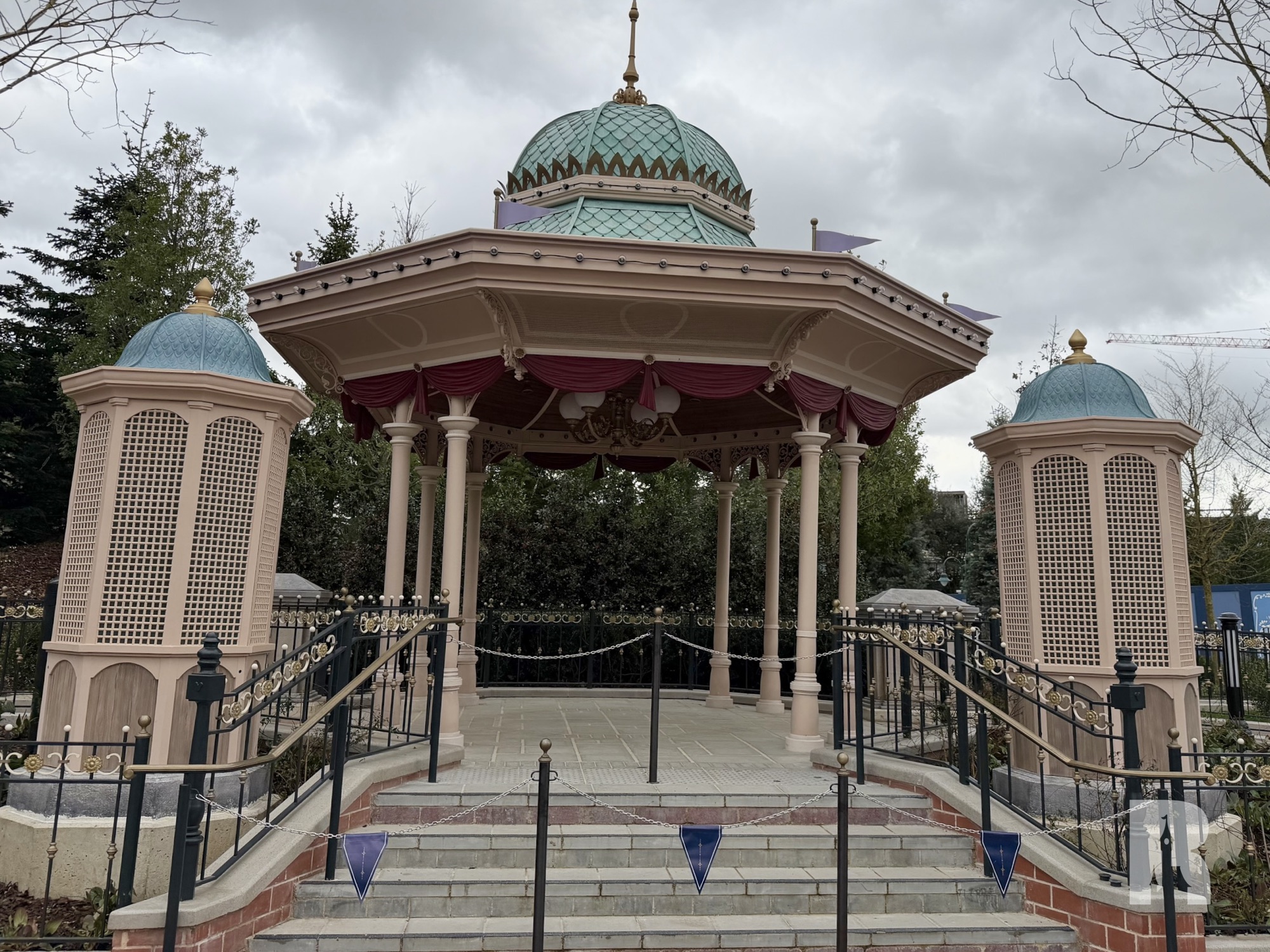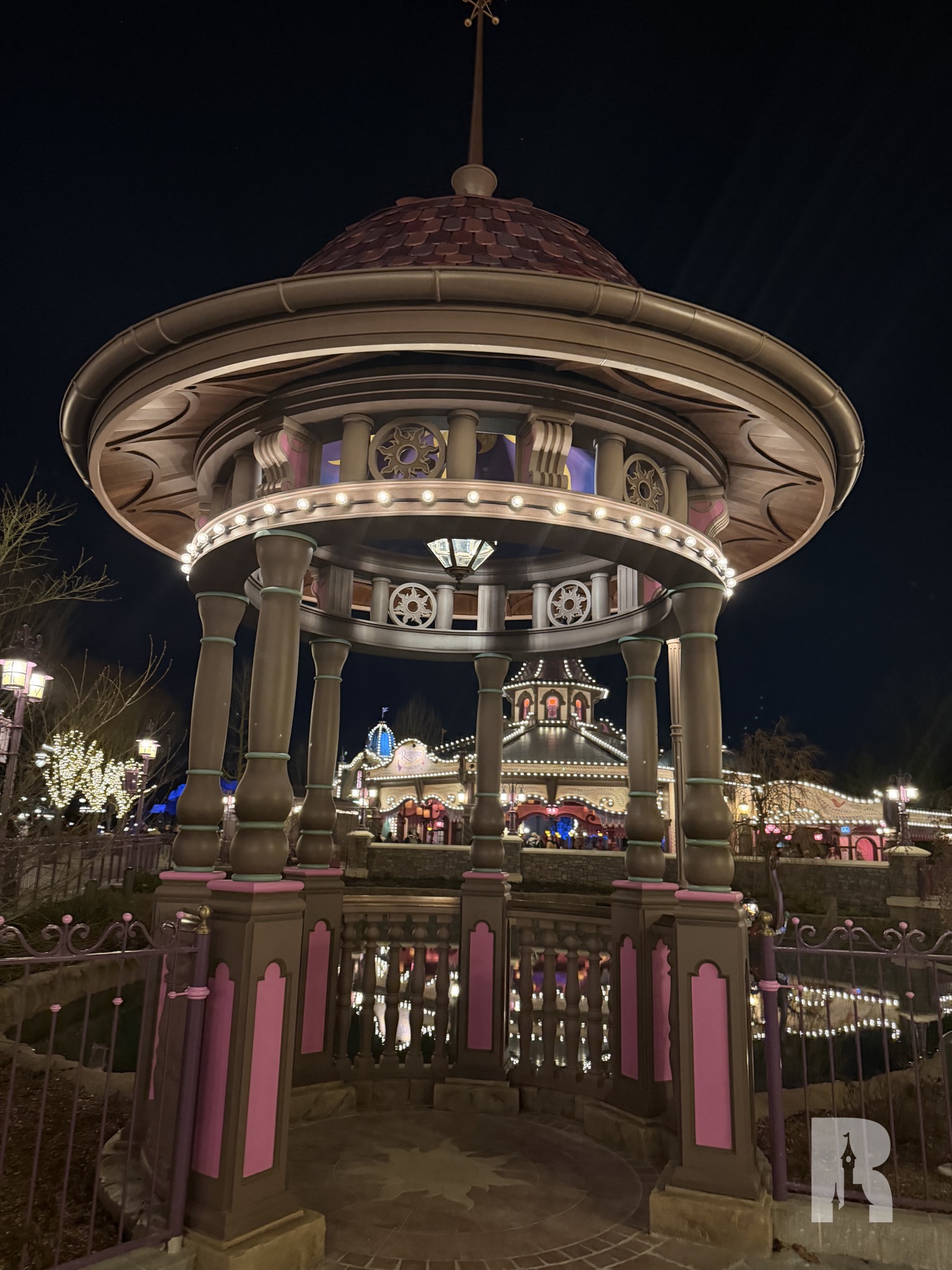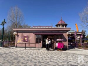 Next to the attraction is a small themed gazebo and a small shop with a bright pink ceiling, tying this “garden” together.
