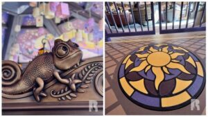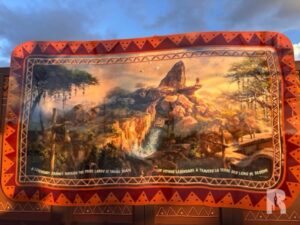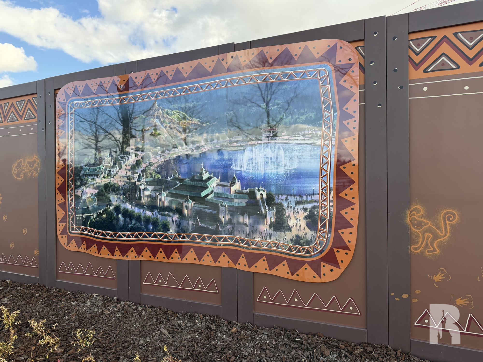 One of the backstage gate (and the landscaping, see photo in next section) already gives us a taste of the Pride Lands with wall color and lighting fixture. There’s also the big concept art of course which now features the animated characters.