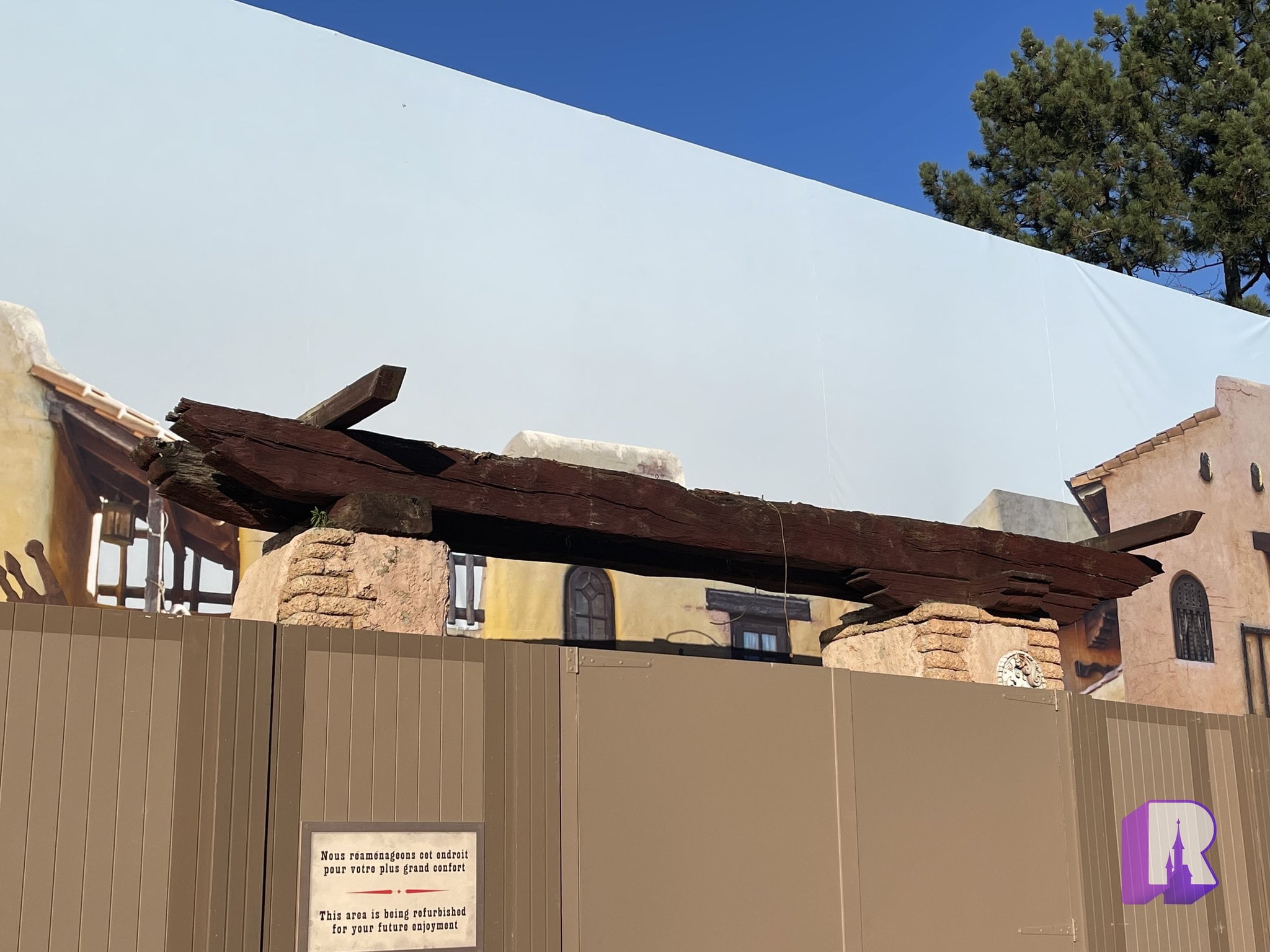 Over in Frontierland, work continues at Fuente Del Oro, which is being reimagined, including amongst other things the covering of the terrace. We can see here that part of the entrance sign been dismantled.