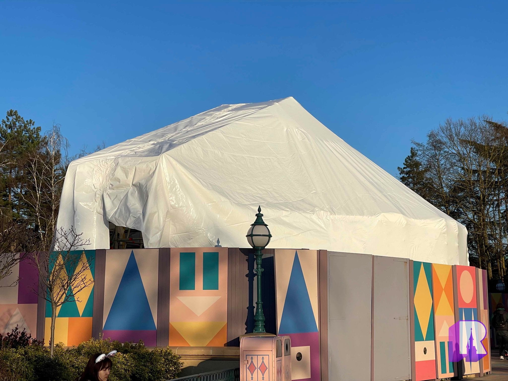 We start at ‘it’s a small world’ where the refurbishment is dragging along. A new temporary crane was added to work on the roof of the building, while at the entrance fountain an entire tent was built in order to work on it. There is still no reopening date for the Attraction. Meanwhile, just across the street work is going along nicely at the new Bella Notte dining room, which should be ready very soon.