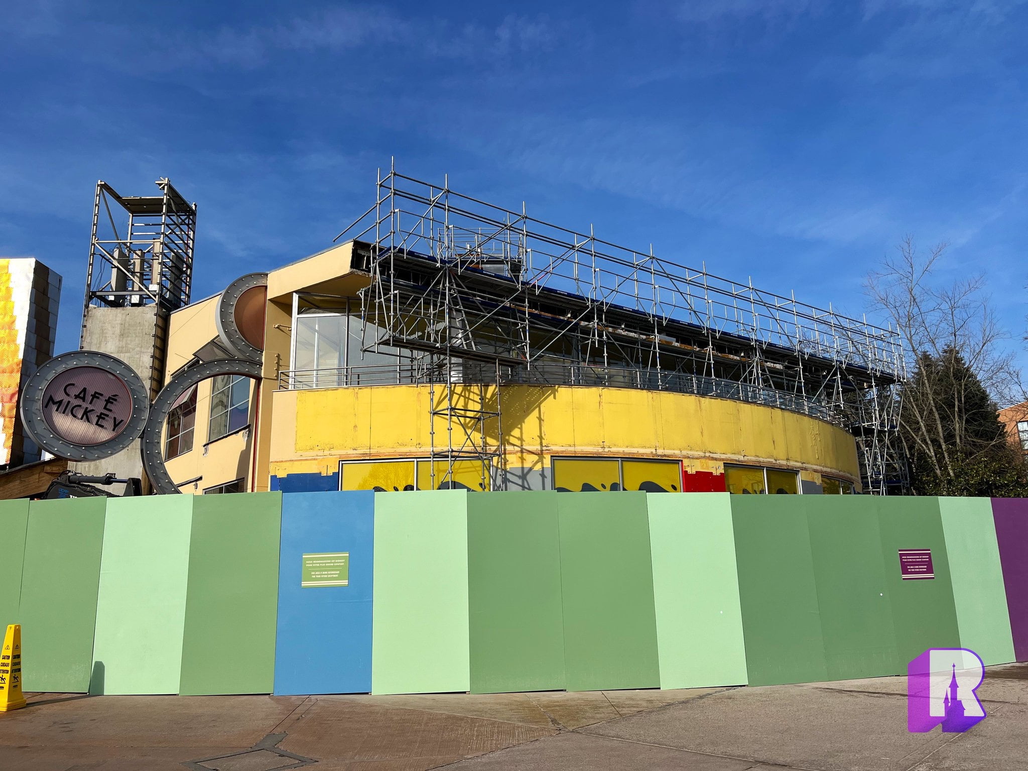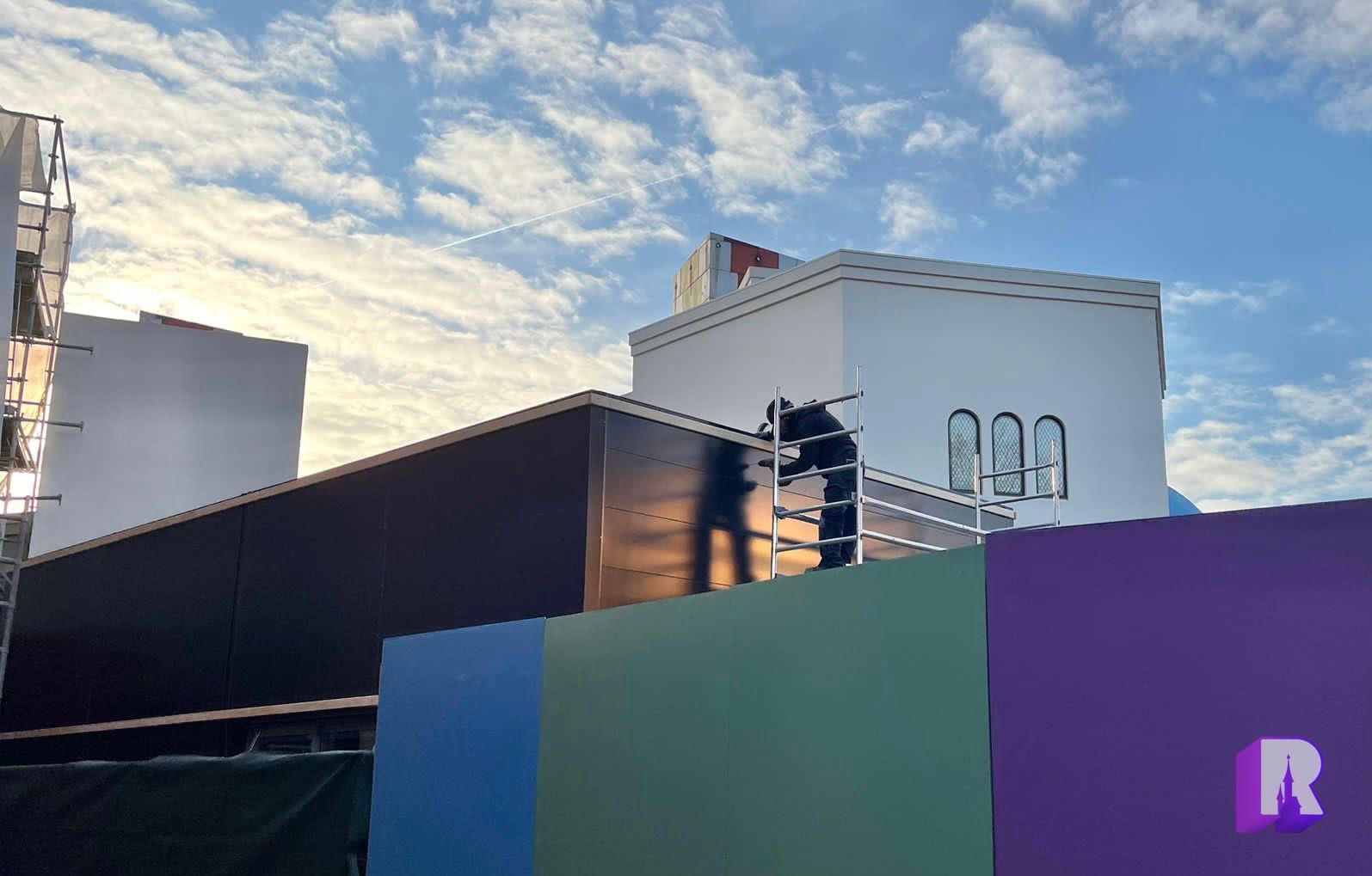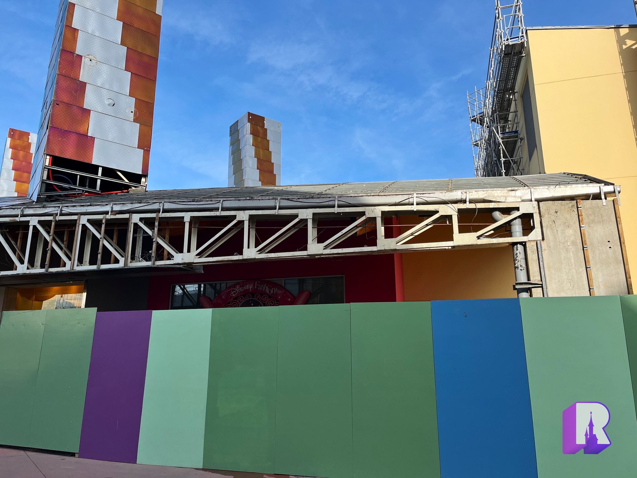 Moving over to Disney Village, which is clearly starting to become a huge construction site, the façade of Café Mickey continues to be stripped while the iconic pylons are slowly being removed. Next door at Disney Fashion, the roof structure is being removed as this will be the first location that receives the new Disney Village “theme”.