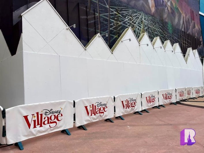 Since we are in the area, let’s continue towards Disney Village in Lake Disney – a very active construction zone. As we pass by Planet Hollywood we noticed that the wall of celebrity hand prints is now covered with some white boards.