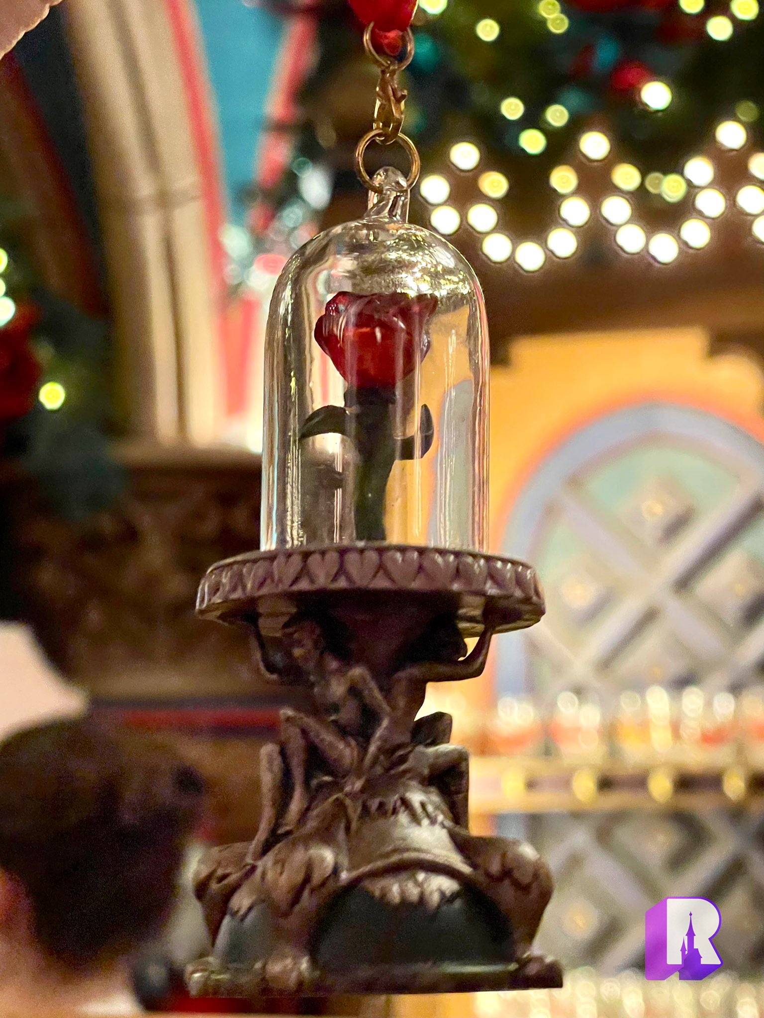In the same “Sketchbook” collection, this 2022 “Disney Key” ornament and a lovely light-up Rose from Beauty and the Beast.