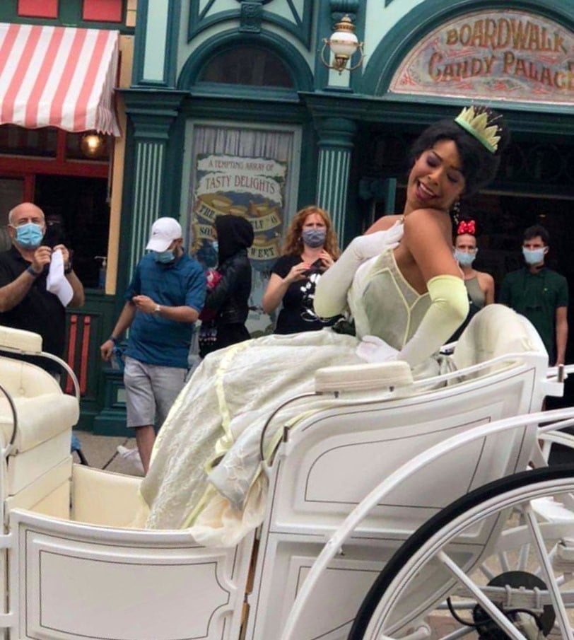 This week Tiana rode the carriage on the Parade Route for the first time since reopening..