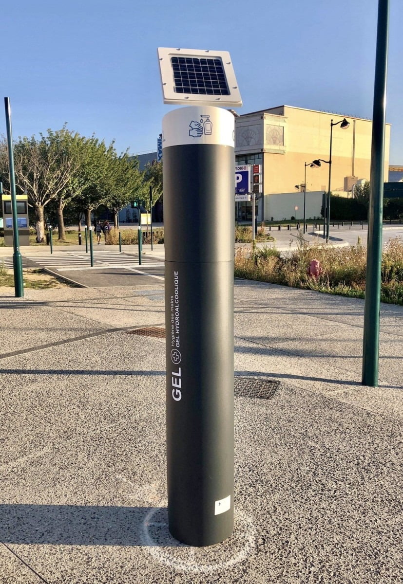 A new permanent solar automatic hand sanitizer dispenser at the bus station – a welcome addition and also sign of the times..
